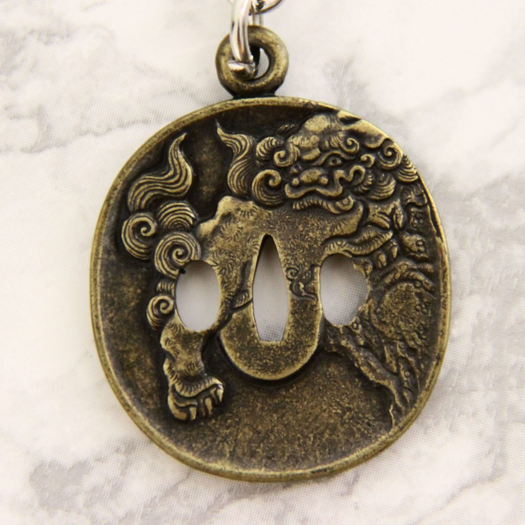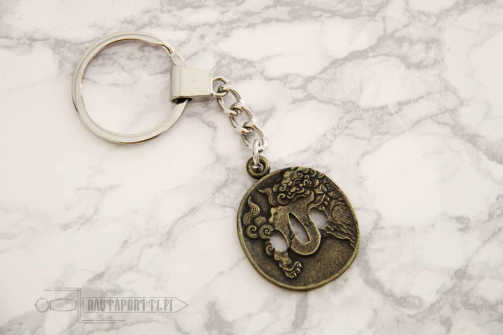 Tsuba, eli Katanan kädensuojalevy, on tämän hienon aseen koristeellisin osa. Tsubaan on useimmiten kuvattuna erilaisia ihmeotuksia, jumaluuksia tai voimakkaita symboleita, joko koristeena mutta myös loitsuna. Miniatyyri tsuba tuo palan itämaista kansanperinnettä ja taikaa arkipäivään, ja on myös erinomainen pieni lahja itämaisten taistelulajien harrastajalle.