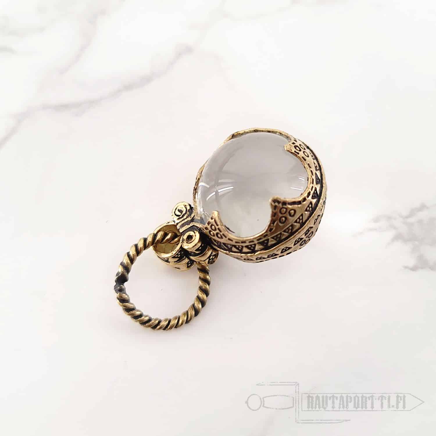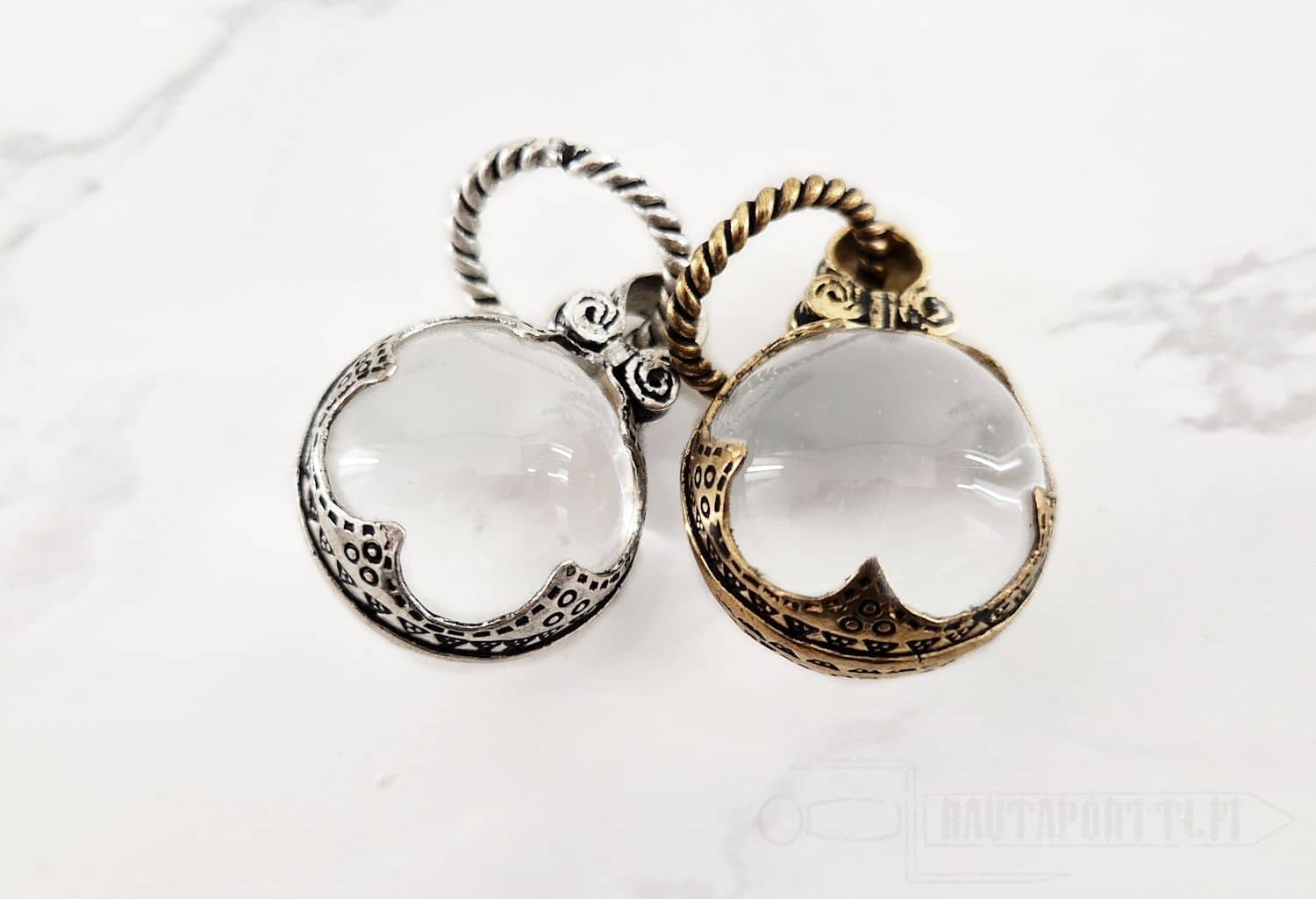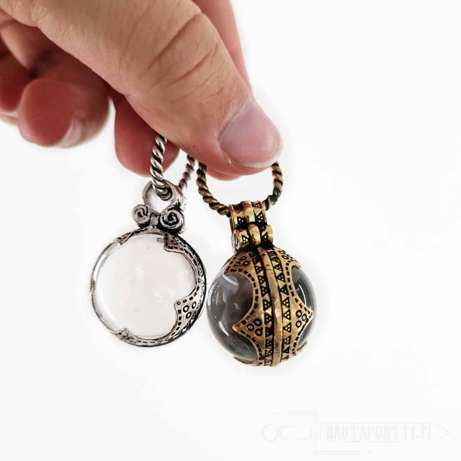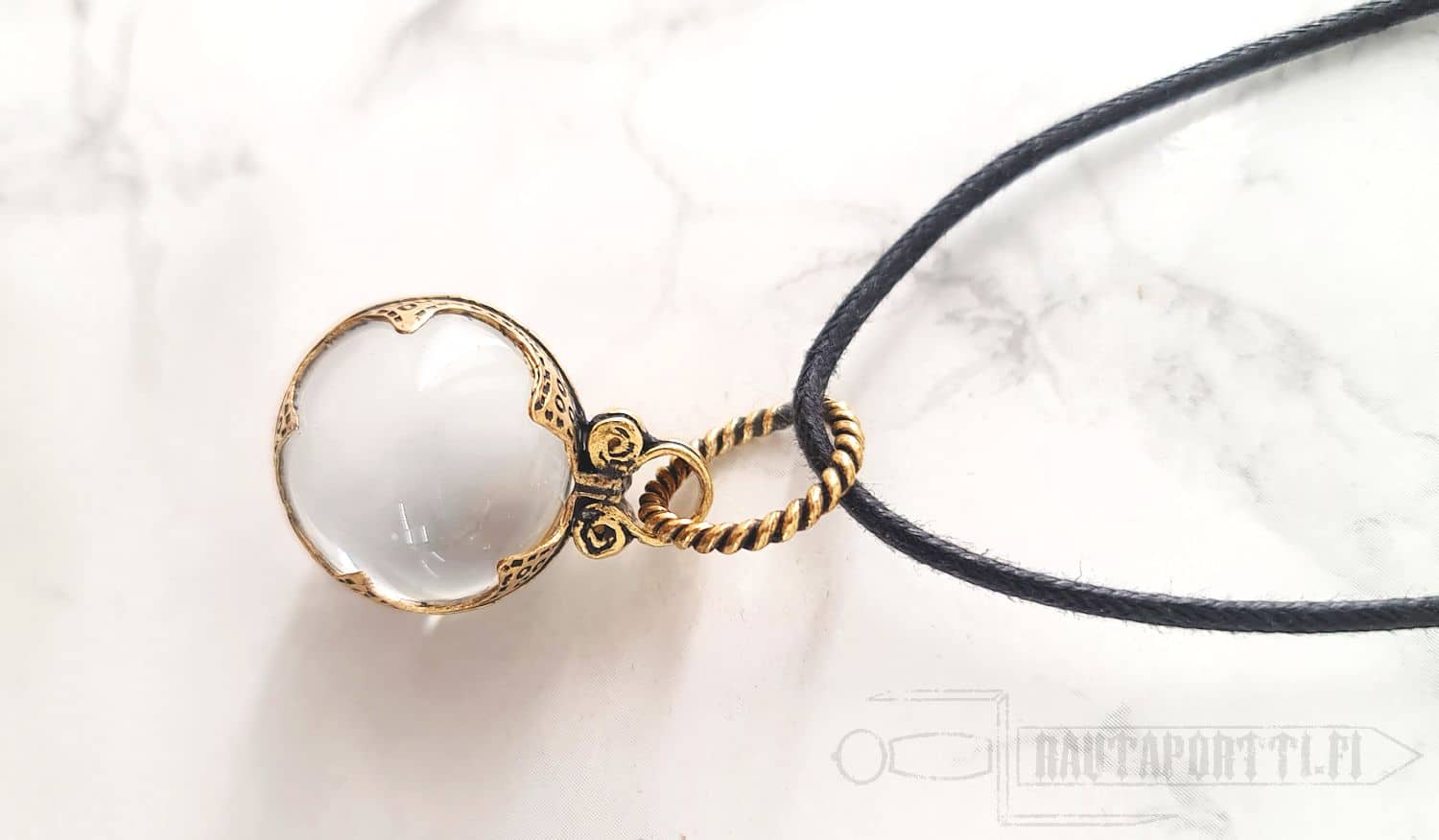 Toisin kuin alkuperäiset, kvartsista valmistetut mallit, meidän riipuksemme pallo on valmistettu lasista. Kehyksen hopean sijaan on myös valittu kohtuullisemman hintainen pronssi. Korun mukana tulee nyöri.