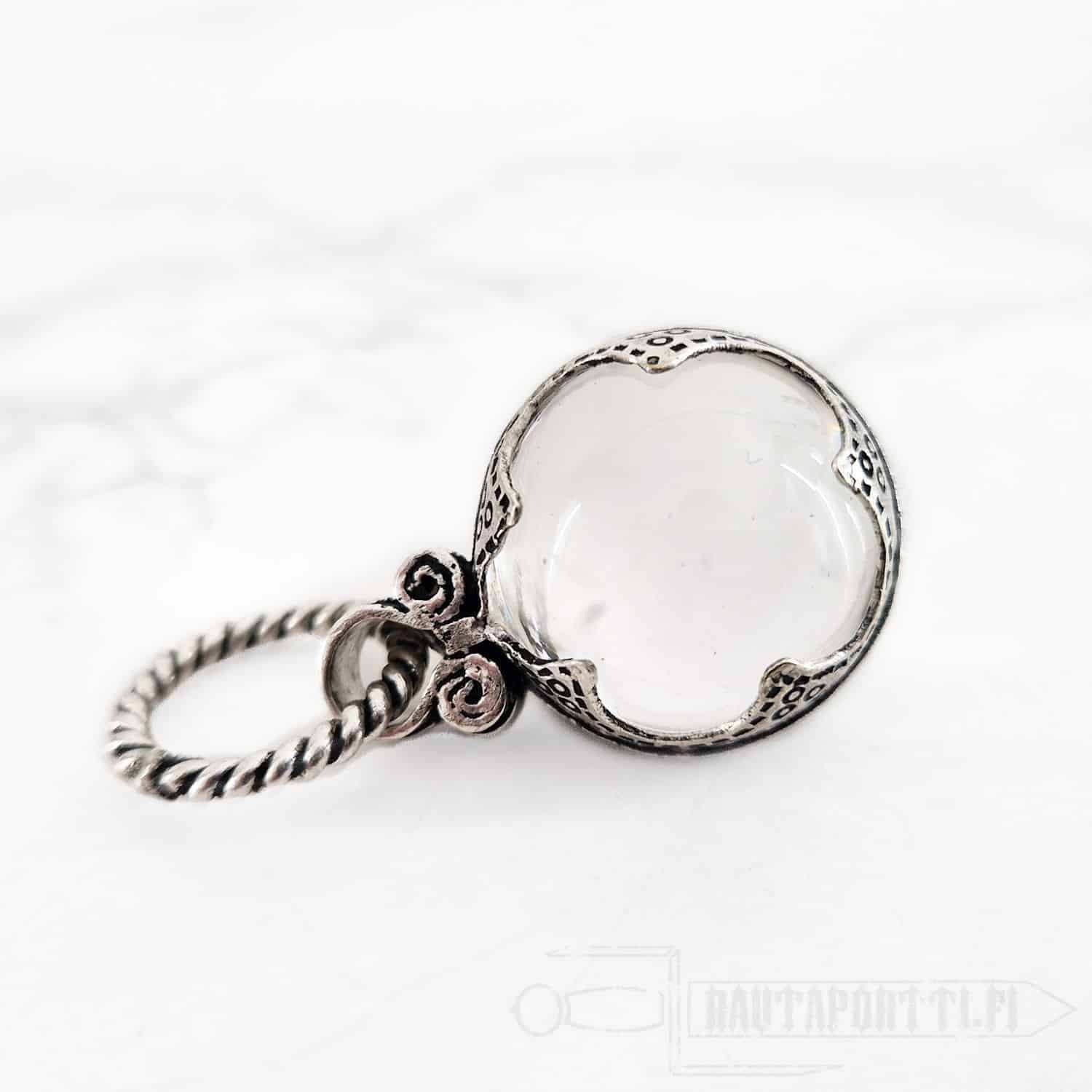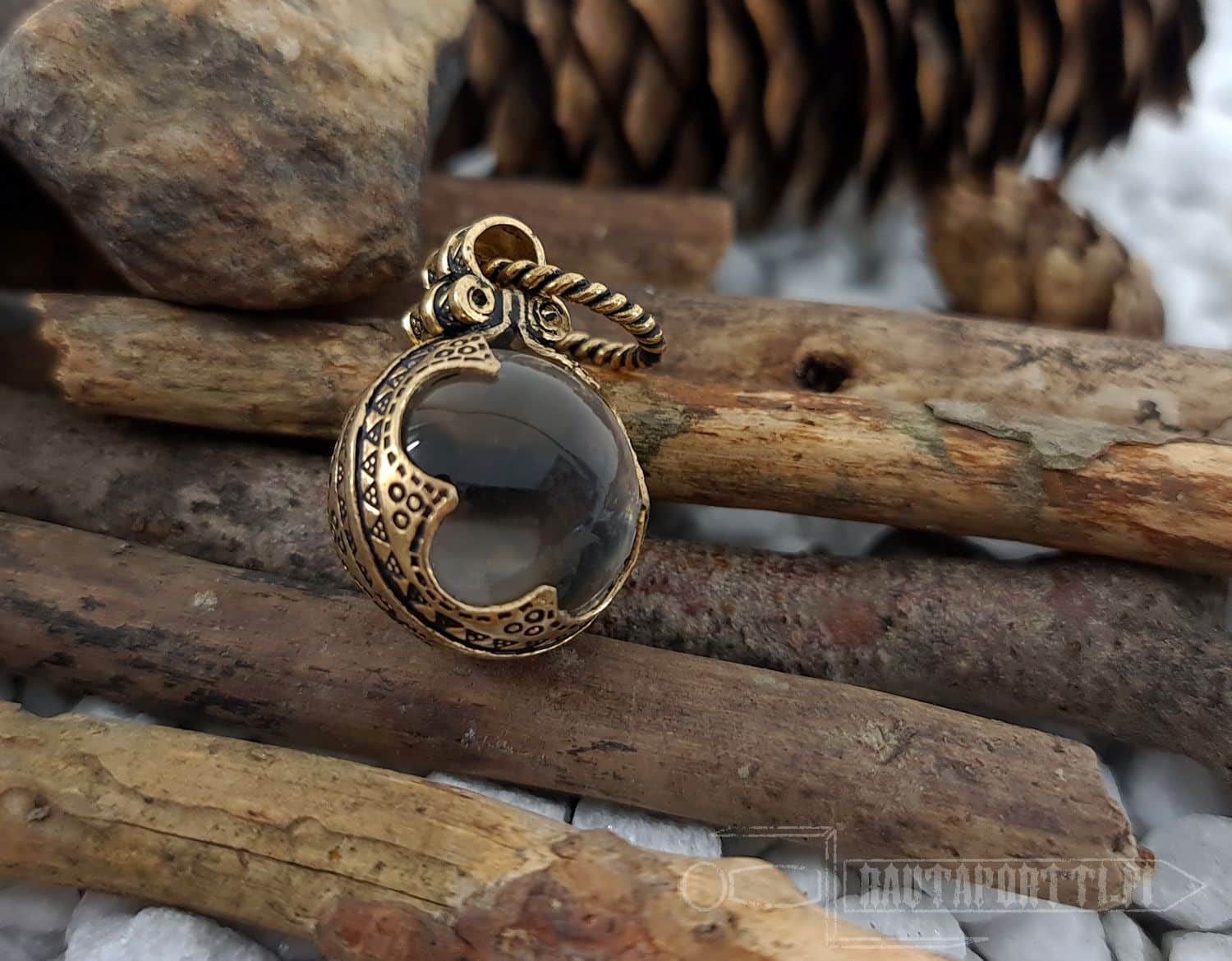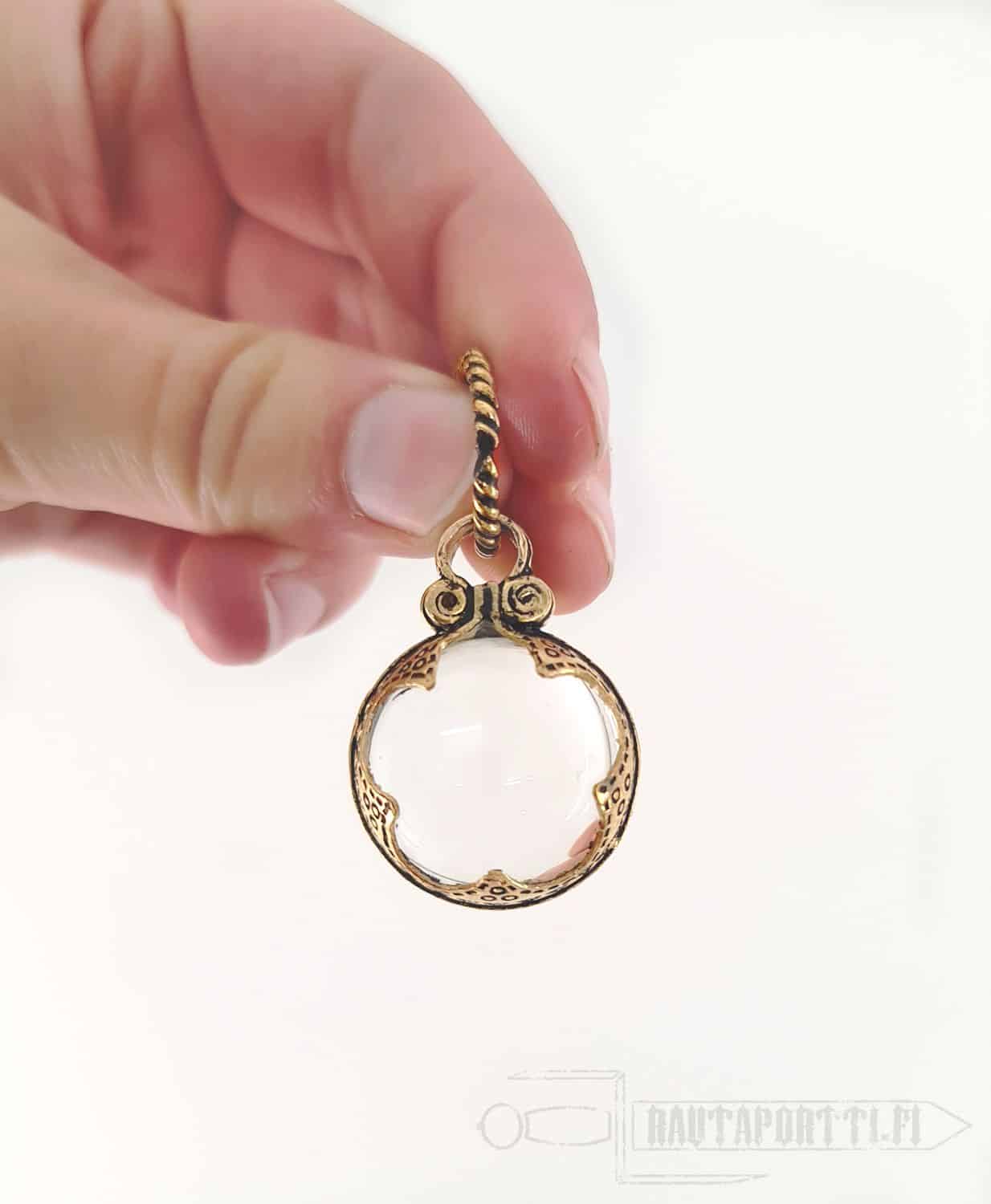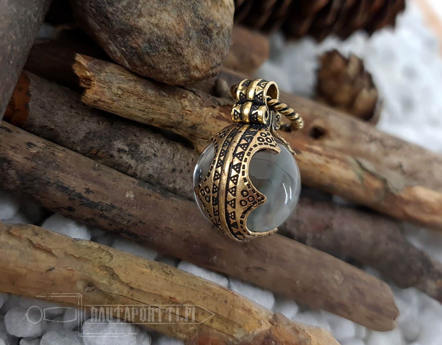 Toisin kuin alkuperäiset, kvartsista valmistetut mallit, meidän riipuksemme pallo on valmistettu lasista. Kehyksen hopean sijaan on myös valittu kohtuullisemman hintainen pronssi. Korun mukana tulee nyöri.