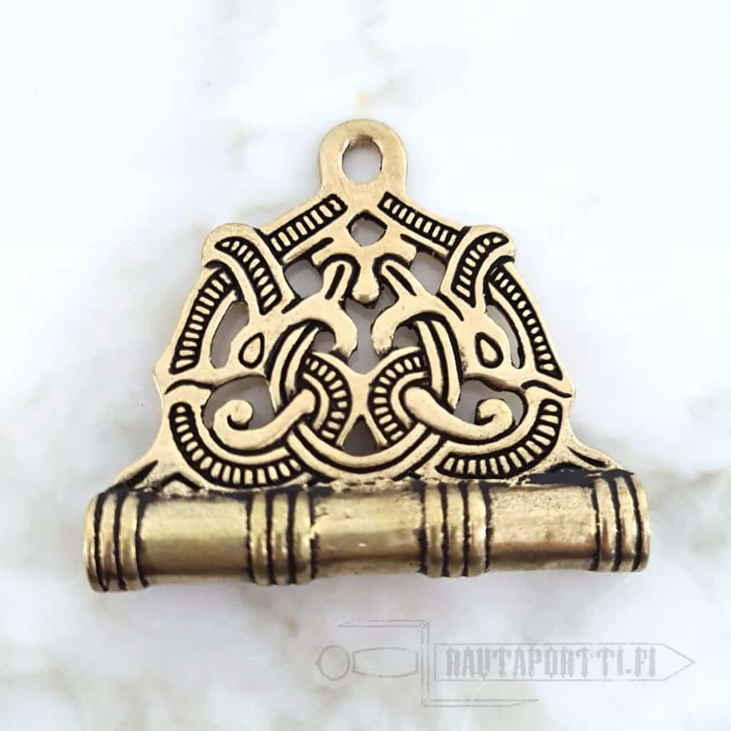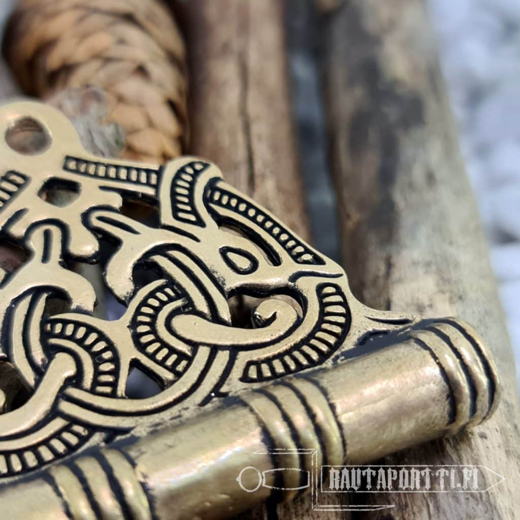Tämä pronssista valmistettu neulakotelo on jäljennös useammasta viikinkiajan neulakotelolöydöstä. Se on koristeltu Jelling-tyylisellä ornamenttikuviolla.