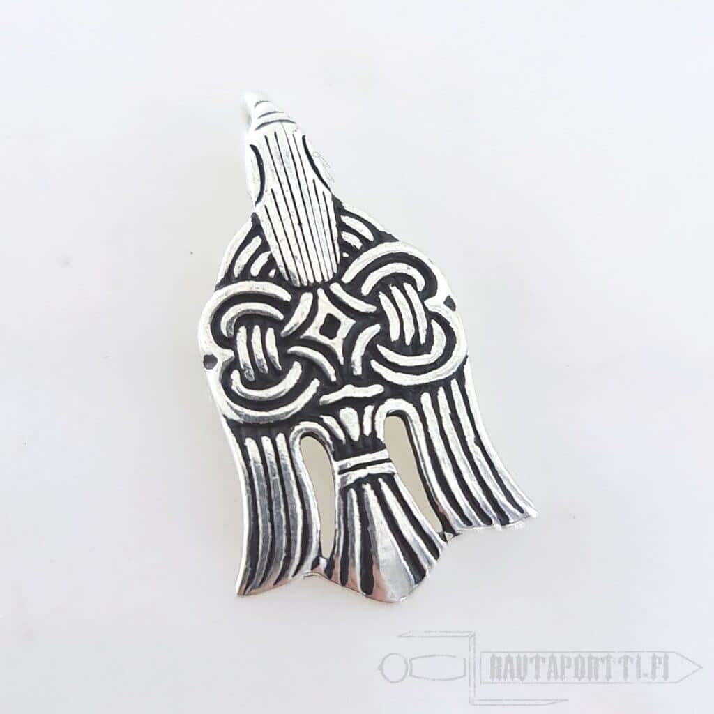 Tämä riipus on valmistettu Tšernigovin viikinkiasutuksesta Ukrainasta löydetyn korppikuvioisen säärisiteen kiinnityskoukun pohjalta. Alkuperäinen koukku on peräisin 900-luvulta. Miltein samanlainen korppikuvioinen koukku on löydetty myös Gotlannista.