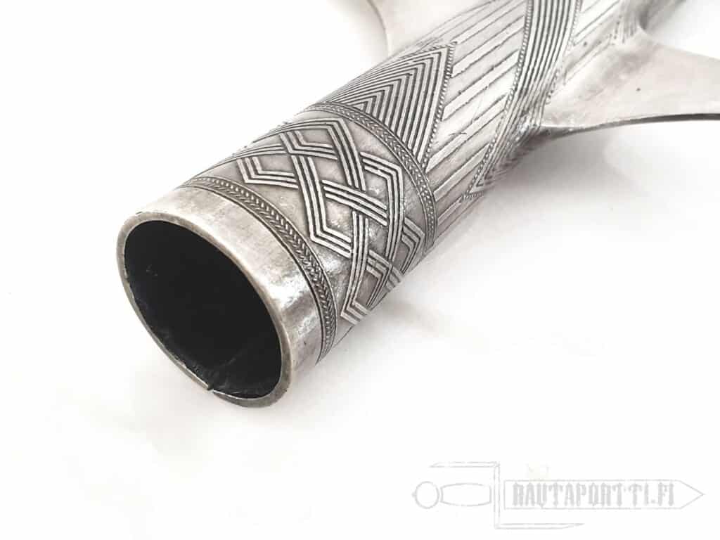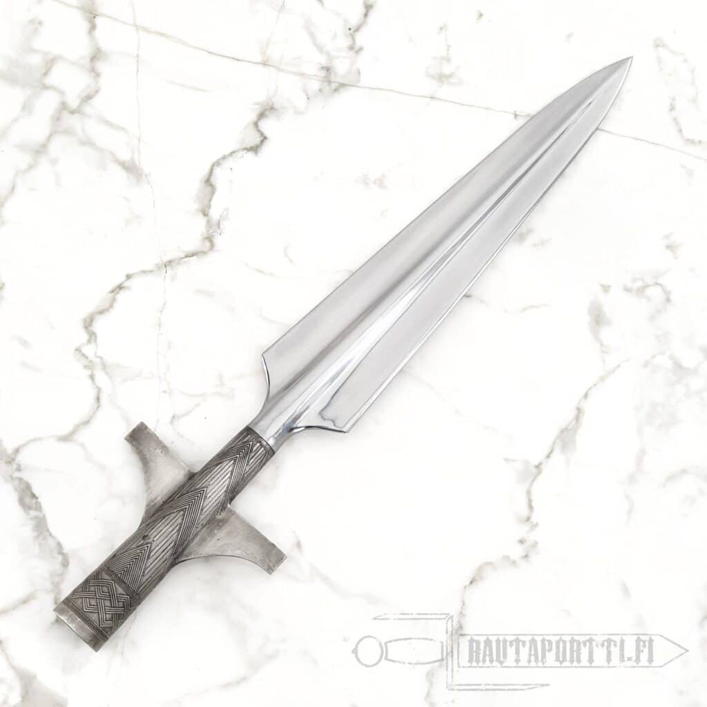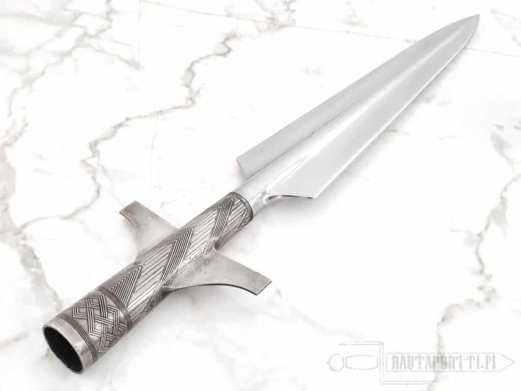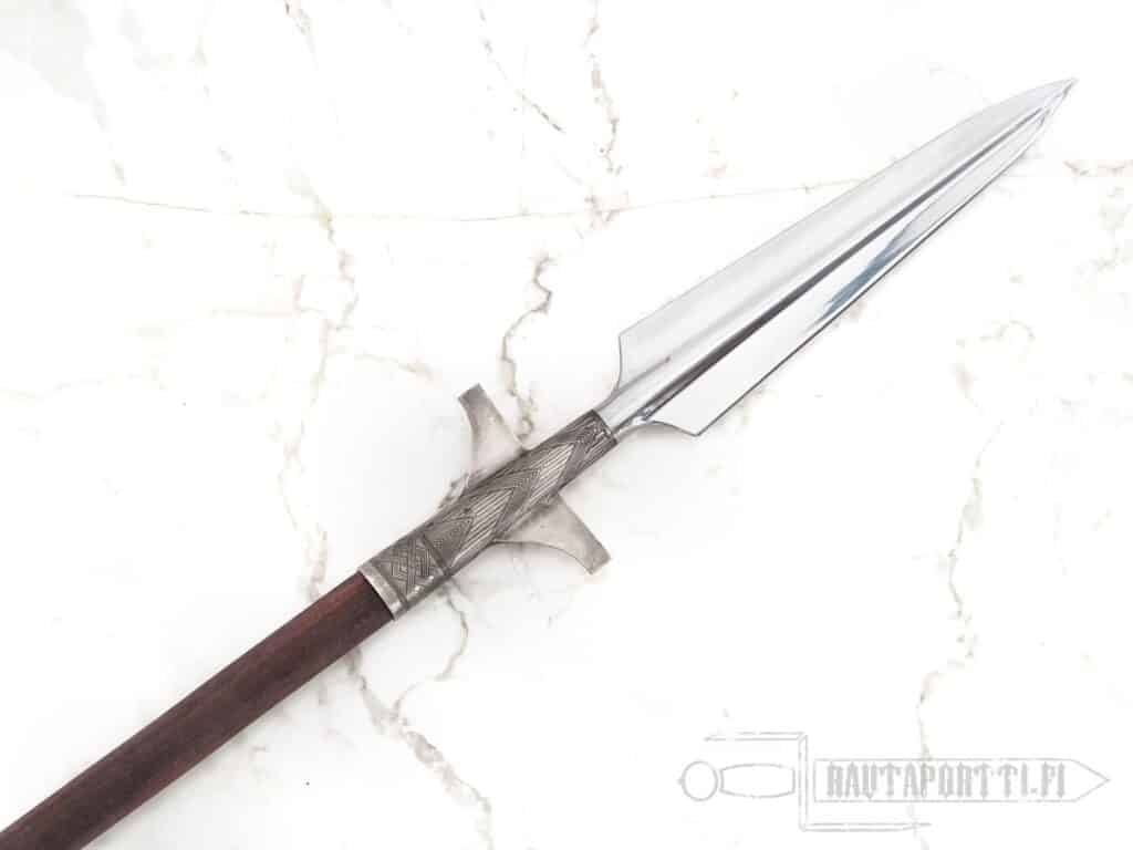- Koska tämä keihäänkärki on valettu, sillä ei ole samaa lujuutta kuin taotuilla keihäänkärillä. Emme suosittele tätä keihäänkärkeä historianelävöitystaisteluihin, koska se ei tule kestämään kovassa harrastekäytössä yhtä hyvin kuin taotut terät.