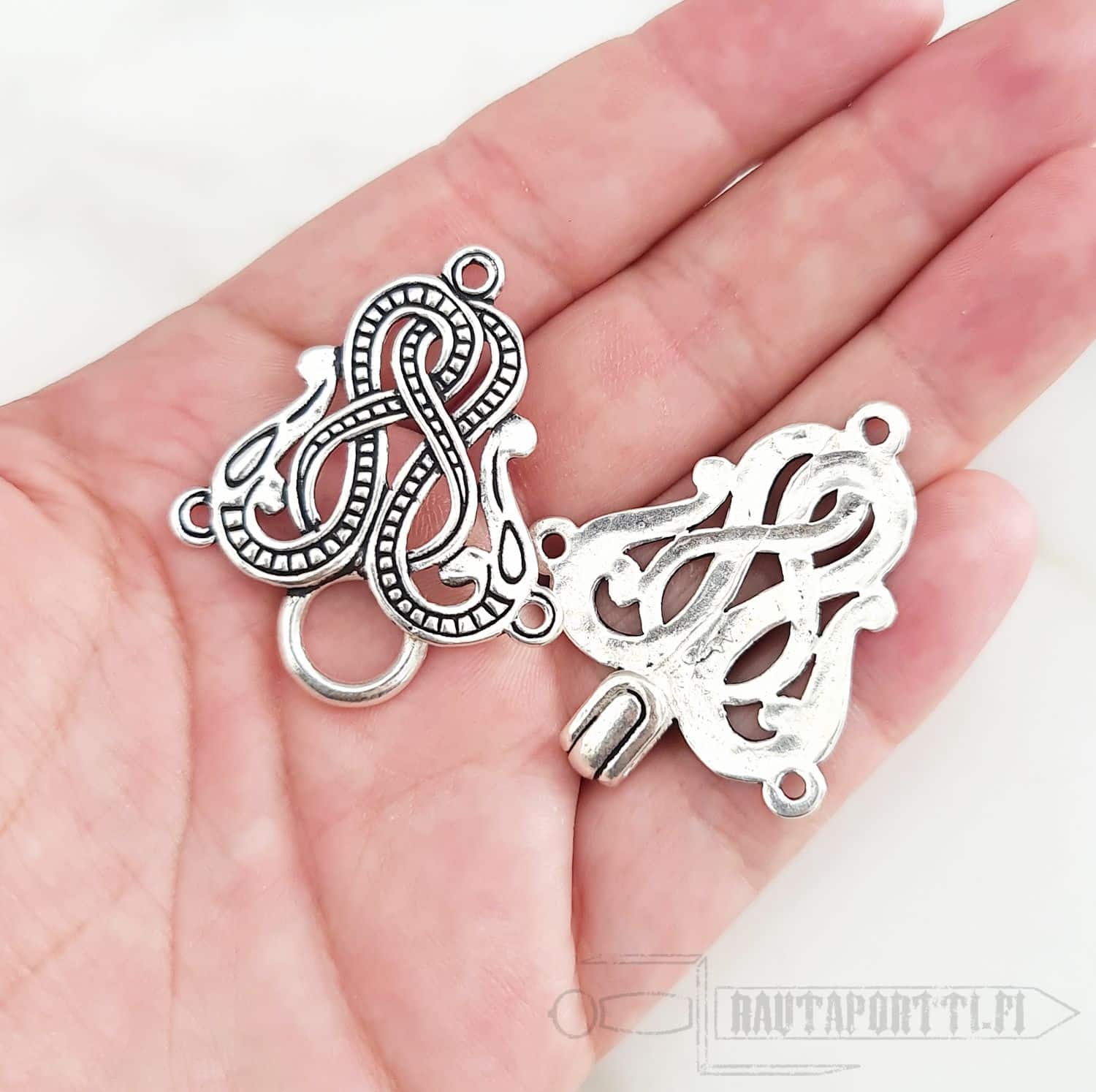 Nämä hakaset ovat kokoonsa nähden kätevän kevyet, ja toimivat luontevasti viittojen ja muiden vaatekappaleiden kiinnityksinä. Hakasissa on valmiina kolme uloketta/rengasta, joista soljet on helppo ommella kiinni vaatekappaleeseen. Ompele käsin pienellä neulalla hakasen toinen puoli kiinni toiselle puolelle etumusta ja hakasen toinen osa toiselle puolelle. Hakaset on päällystetty aidolla hopealla.