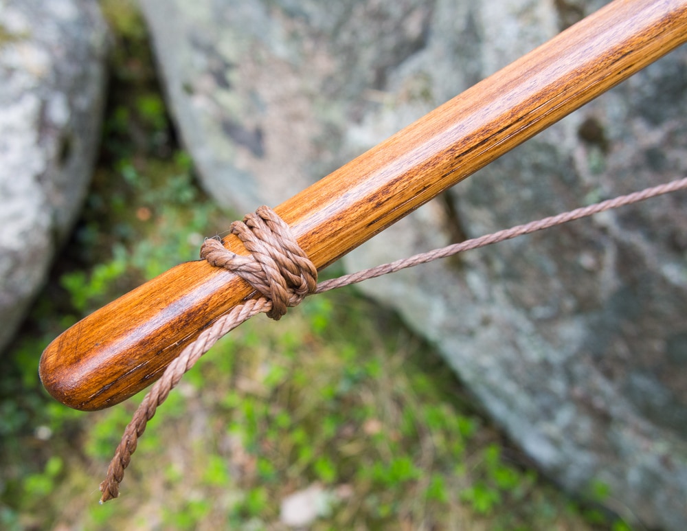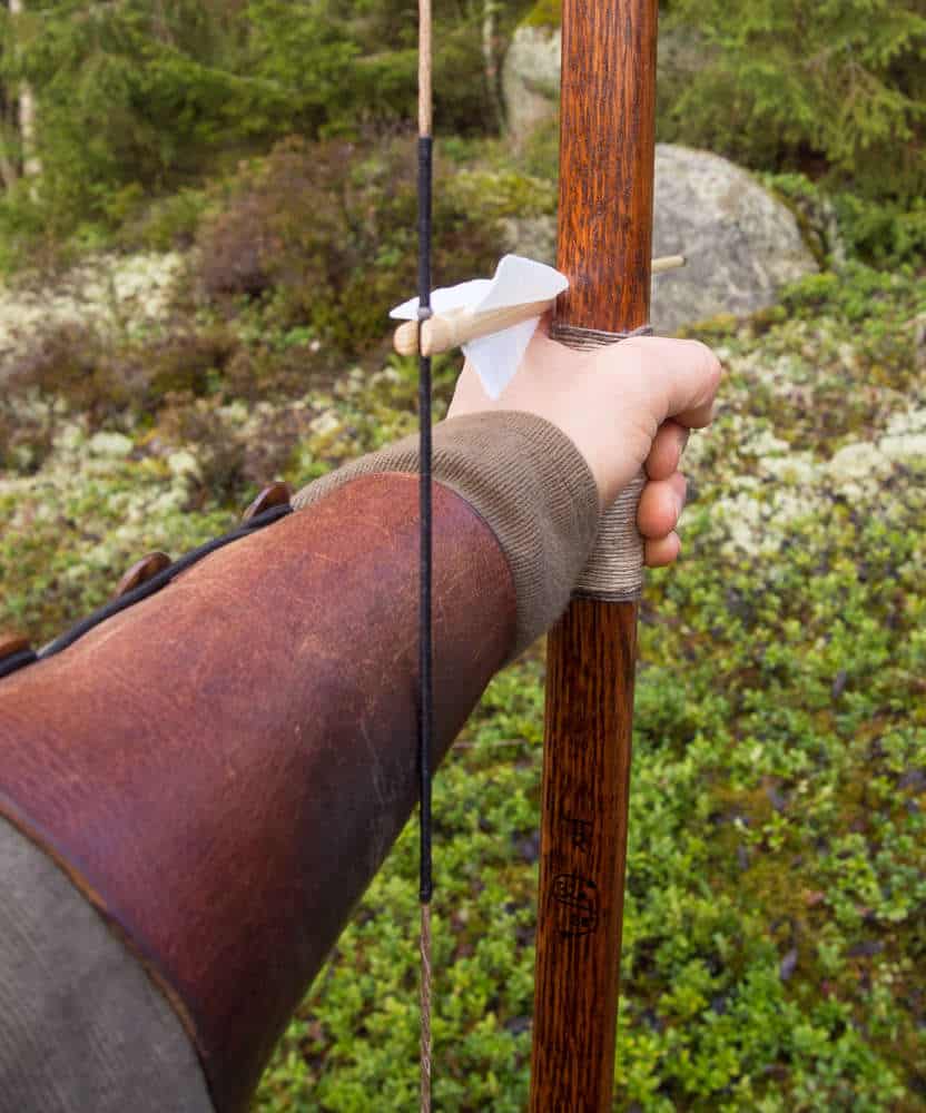 Tämän jousen jänne voi aina olla kiinnisidottuna jousen alapäähän ja kun jänteen yläpään silmukan sujauttaa jousen ylälavan nokkiin, niin jänneväli on oikea ja myös nuolen nokinpaikkaa merkkaava kohouma on oikeassa kohdassa.