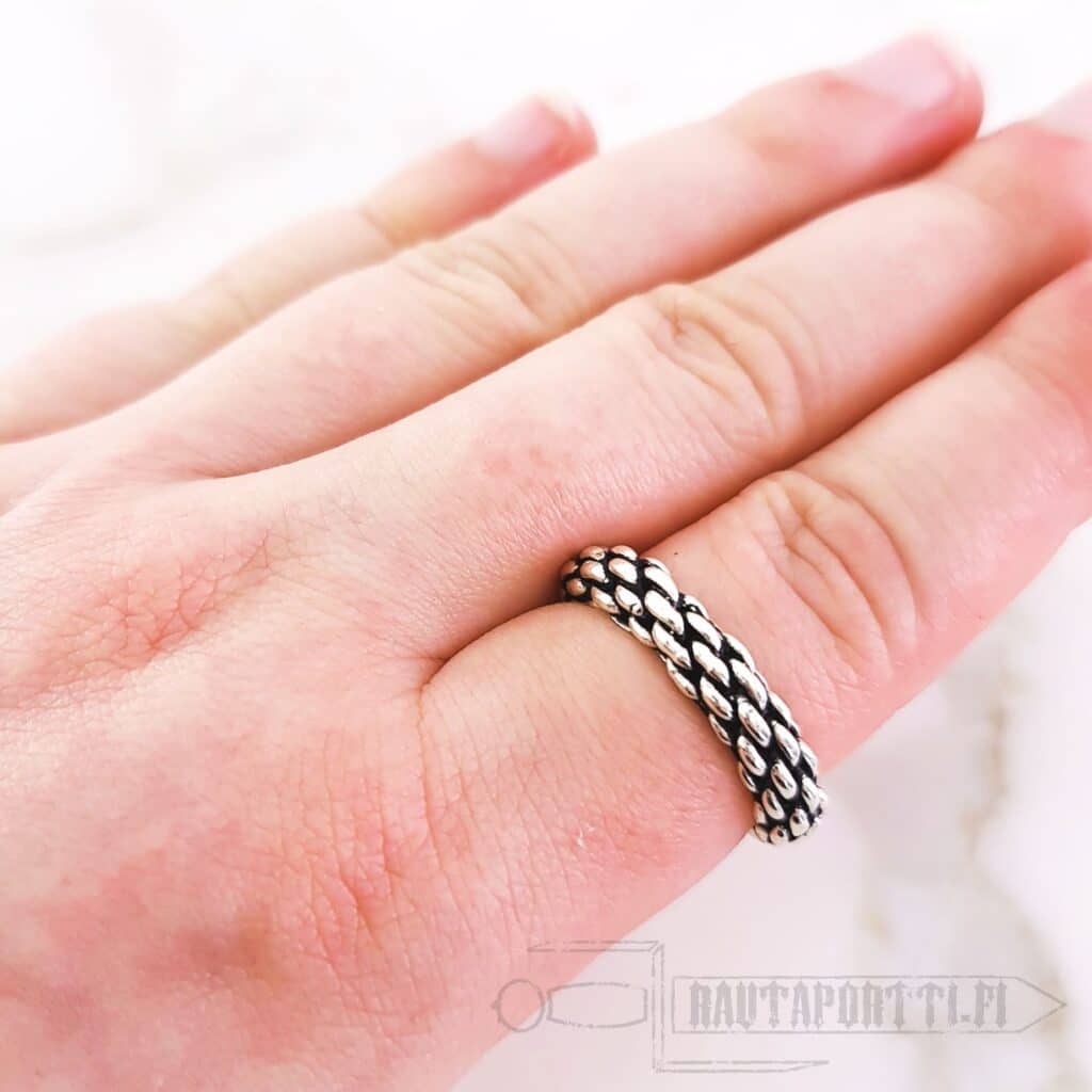 Metallilangoista punotut ketjumaiset sormukset olivat kenties viikinkiajan suosituin sormustyyli, ja niitä on löydetty useimpien viikinkiaikaisten asutuksien kaivauksista. Ulkoisesti tämä sormus muistuttaa melko tarkasti alkuperäisiä sormuksia, mutta se on rakennettu niistä poiketen yhdestä metallilangasta, kun alkuperäiset on tehty kahdesta tai useammasta yksittäisestä langasta. Lisäksi tätä jäljennöstä on hieman litistetty sisäpuolelta, jotta sen käyttö on mahdollisimman mukavaa jokapäiväisenä käyttösormuksena.