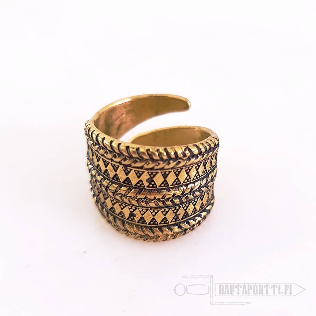 Kuten useimmat viikinkiajan sormukset, on myös tämä sormusjäljennös ns. avosormus, eli se ei muodosta suljettua ympyrää. Sormukseen jäävän raon avulla sitä on mahdollista säätää sopimaan eri kokoisille sormille 17 mm sormuskoosta aina 21 mm sormuskokoon. Tämä viikinkisormus on valmistettu korkealaatuisesta pronssista, ja se sopii täydellisesti asusteeksi historian elävöittämiseen, larppaamiseen tai arkikäyttöön.