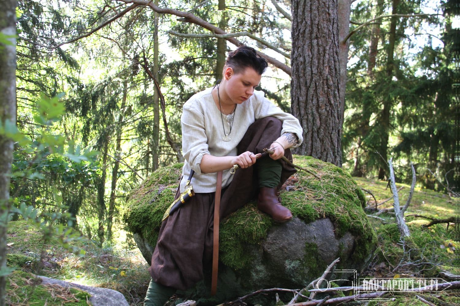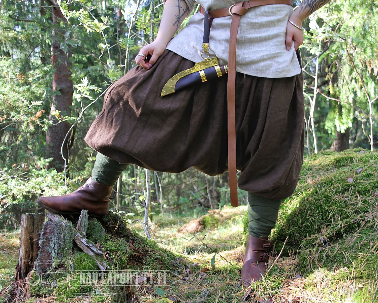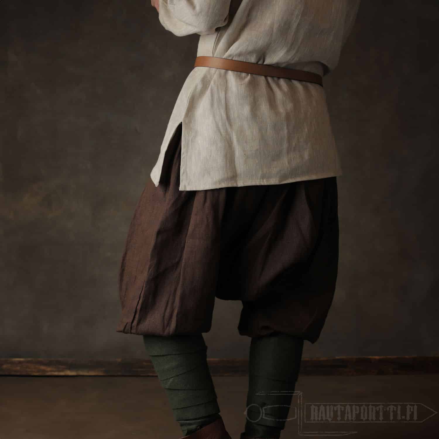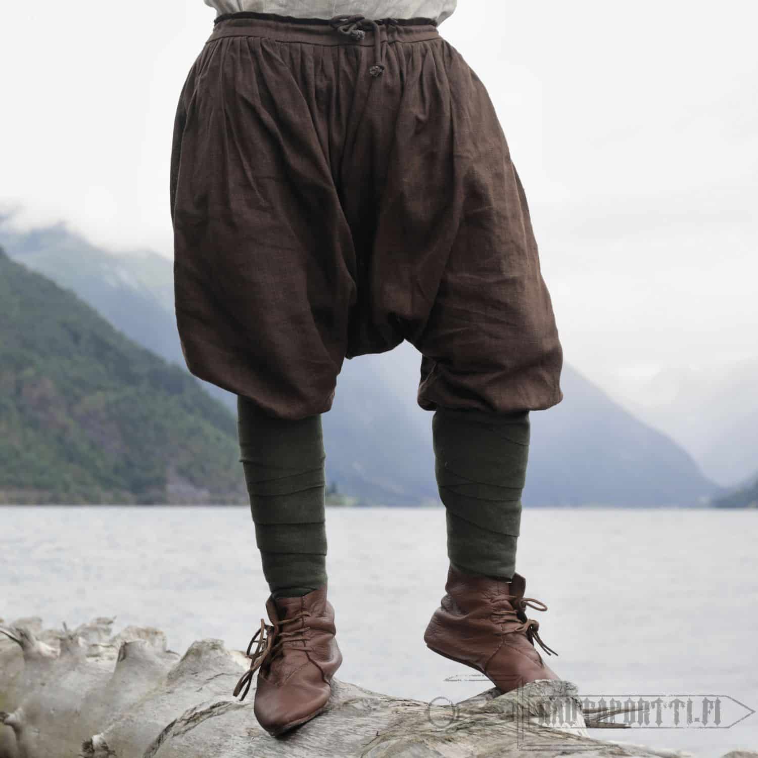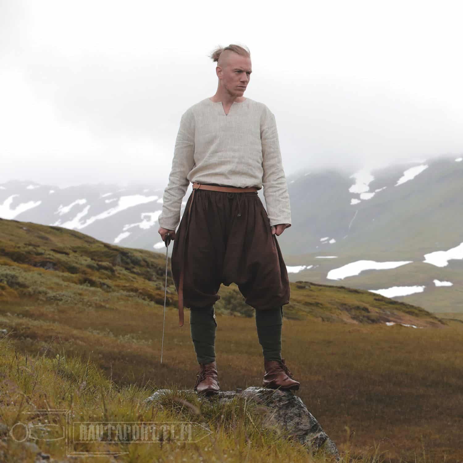 Erinomaiset housut viikingeille ja muille varhaiskeskiajan sotureille Housumalli perustuu säilyneisiin housufragmentteihin, aikalaistaiteeseen ja aikansa kirjallisiin kuvauksiin Erittäin mukavat housut Pussihousut näyttävät hyviltä säärisiteiden kanssa, mutta housuja voi käyttää myös ilman säärisiteitä Materiaali on 100 % tukevaa, paksua ja kestävää Itämeren pellavaa Saatavana ruskeana Vyötärö kiristetään nyörillä Taskut piilossa sivusaumassa Saatavilla koot: XS, S, M, L, XL, XXL ja XXXL