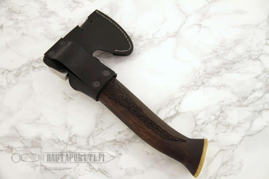 Kirveen mukana toimitetaan käytännöllinen teräsuojus, joka suojaa niin terää käyttäjältä kuin käyttäjää terältäkin. Teräkotelo on samalla myös vyöpidike, josta kirveen saa helposti roikkumaan vyölle tai repun kylkeen. Vyöpidikkeestä mahtuu läpi maksimissaan 6 cm leveä vyö. Tämä pieni retkikirves on saman aikaisesti niin käytännöllisen kokoinen käyttöesine kuin myös kaunis koriste-esine.