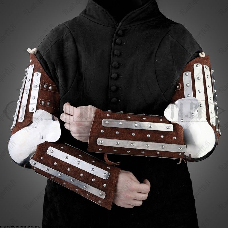 Tämä käsipanssari muodostuu kolmesta osasta jotka suojaavat käsivarren, kyynärpään ja olkavarren. Haarniska on valmistettu paksusta mokkanahasta ja 2 mm paksuista terässplinteistä/-liuskeista. Käsisuojissa on säädettävä kiristys, ne ovat taipuisat ja kevyet. Painoa on n. 3,4 kg per pari. Nahan luonteesta johtuen pinnassa saattaa olla pieniä jälkiä tai epätasaisuuksia. Pinnan karheus ja värisävy saattaa vaihdella hieman kappaleesta toiseen värjäysprosessissa käytettävien perinteisten työtapojen sekä nahan ominaisuuksien vuoksi. Paketissa suojat molemmille käsille.