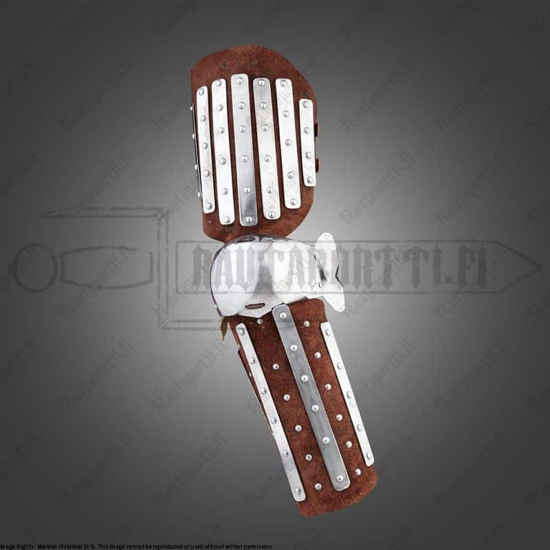 Splint-tyypin haarniskoissa erilliset metallilevyt ja -liuskeet kiinnitettiin niiteillä jämäkkään kankaaseen tai nahkaan Tämän kaltaisia Splint-tyypin haarniska osia on käytetty Visbyn taistelussa 1361 Käsipanssari muodostuu kolmesta osasta jotka suojaavat käsivarren, kyynärpään ja olkavarren Paketissa suojat molemmille käsille Paino: 3,4 kg/pari Materiaali: 2 mm paksu teräs, mokkanahka