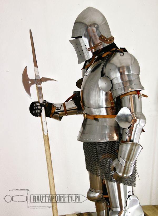 HUOM! Kuvista poiketen tässä buhurt-versiossa ei ole vervellejä (messinkisiä nippoja rengashaarniska-aventailin kiinnittämistä varten) valmiina kiinni, vaikka mallin päällä olevassa kypärässä vervellet ovatkin.