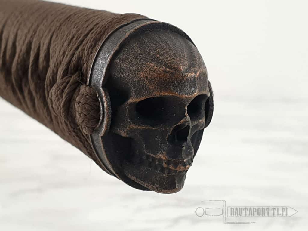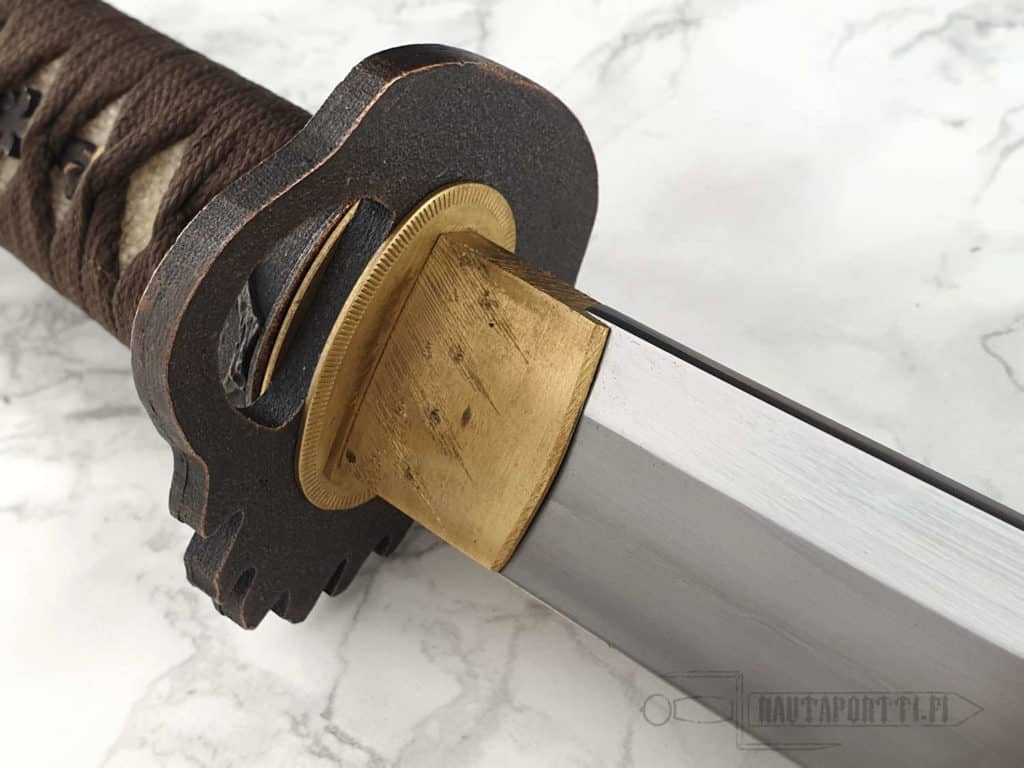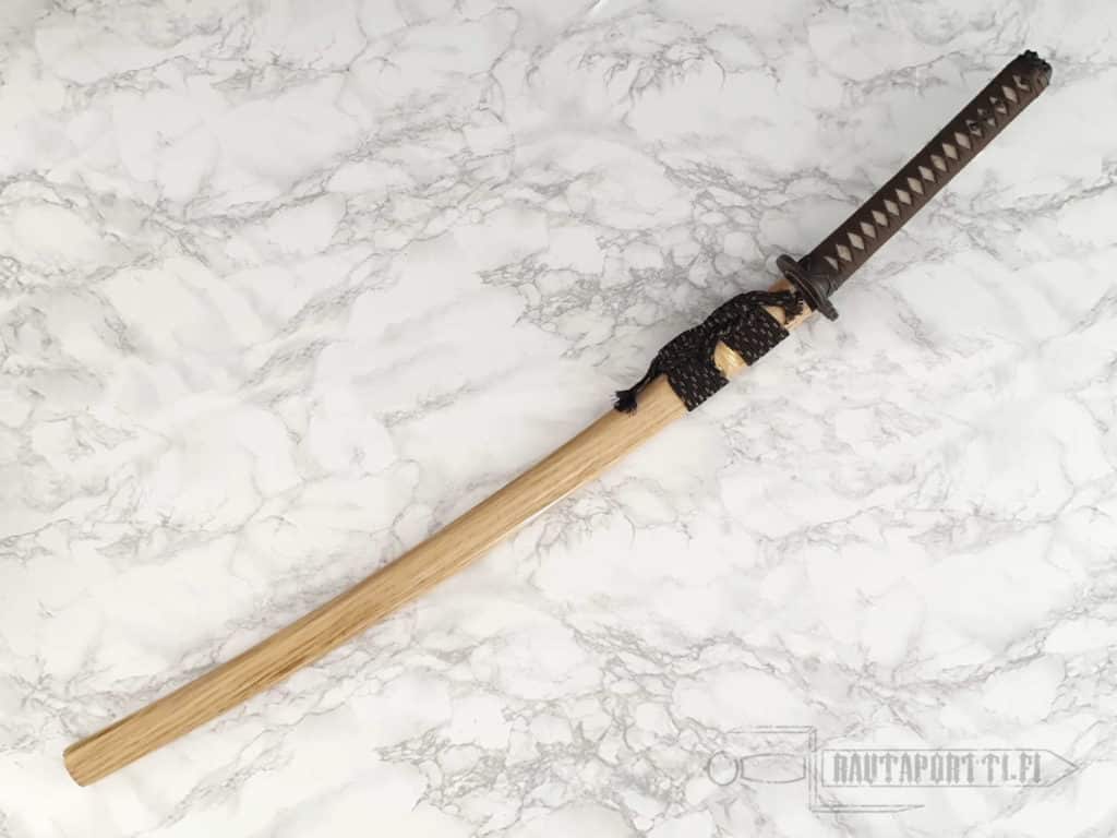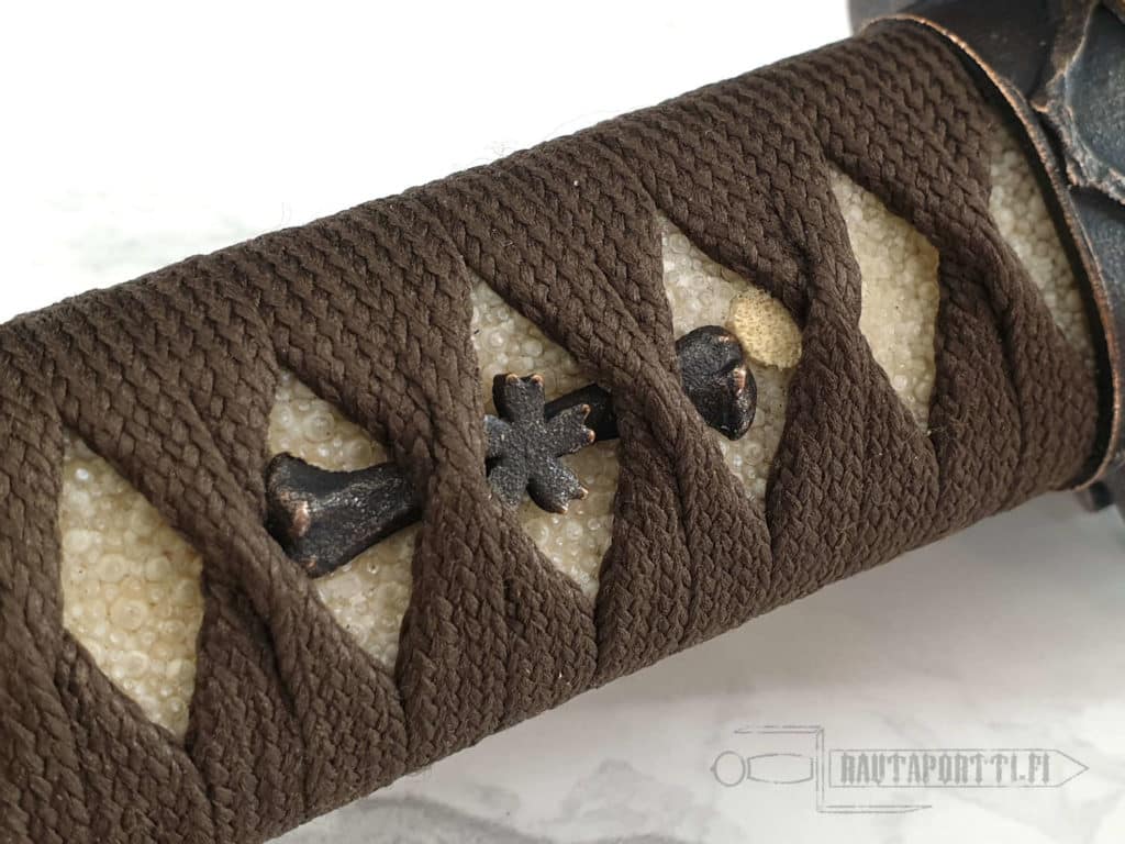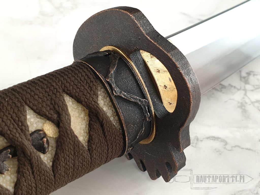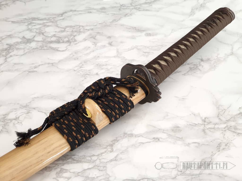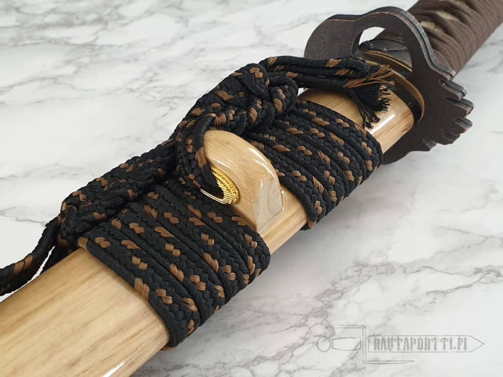 Katanan luonnollista kovapuuta oleva Saya, tuppi, on viimeistelty neljällä lakkakerroksella, aidolla puhvelin sarvesta tehdyllä koiguchilla ja premium-luokan silkkisellä sageolla. Selkeät Zugaikotsu-kuvioiset fuchi, kashira, tsuba ja kaksi menukia ovat tiukasti kiinni kovapuisessa kahvassa. Kahvan päällä on aitoa rauskunnahkaa ja premium-luokan silkkinen nyöritys.