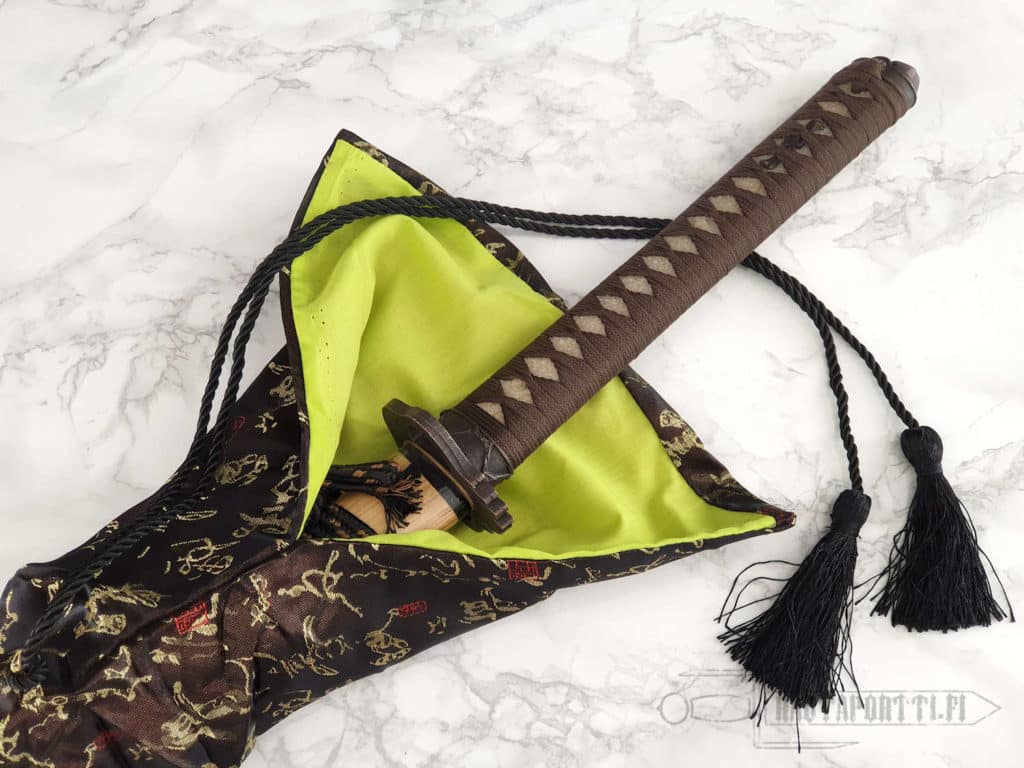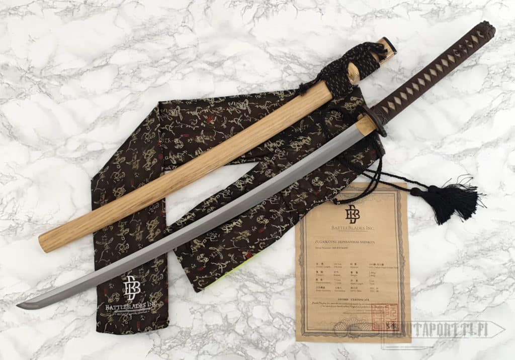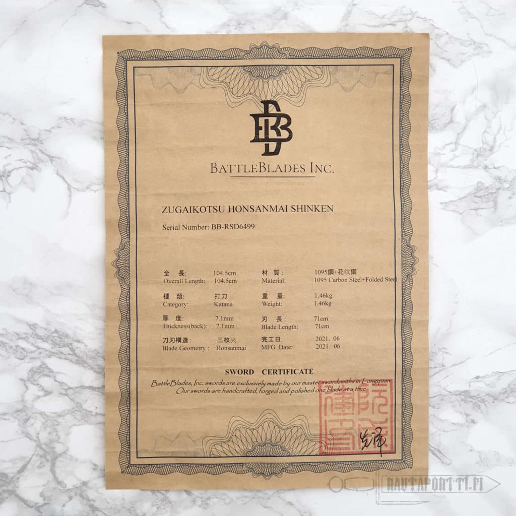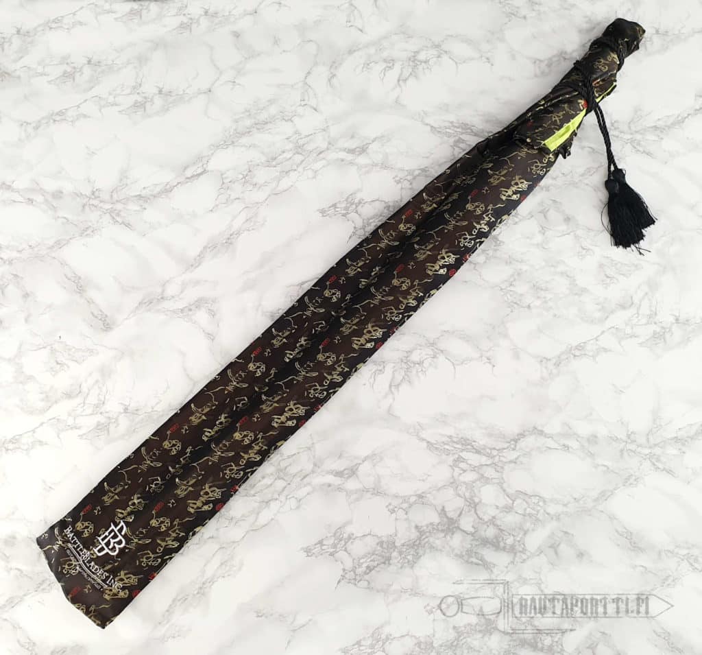 Zugaikotsu Honsanmai Shinkenin mukana tulee brodeerattu BattleBlades Inc:n silkkinen miekkapussi ja aitoustodistus.