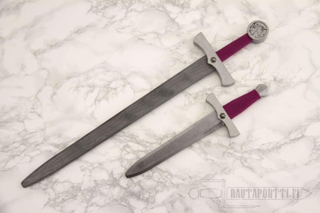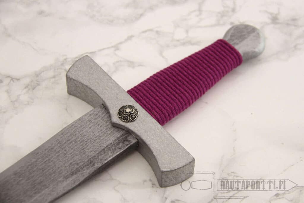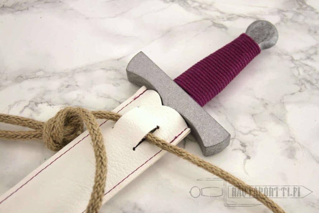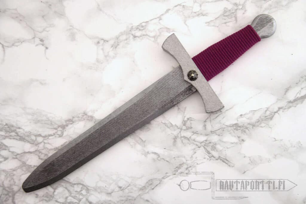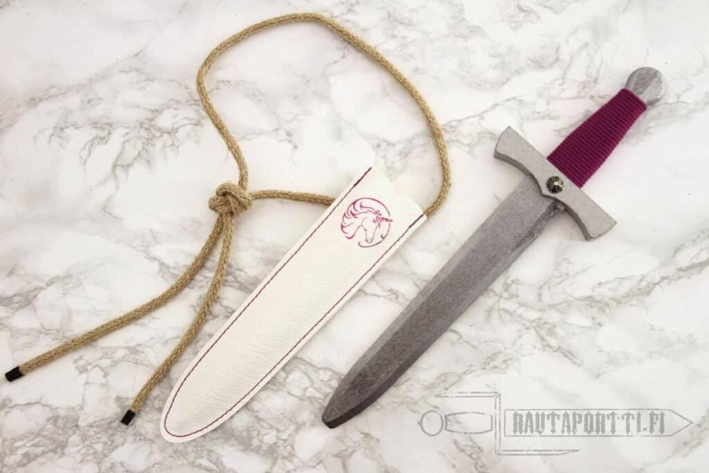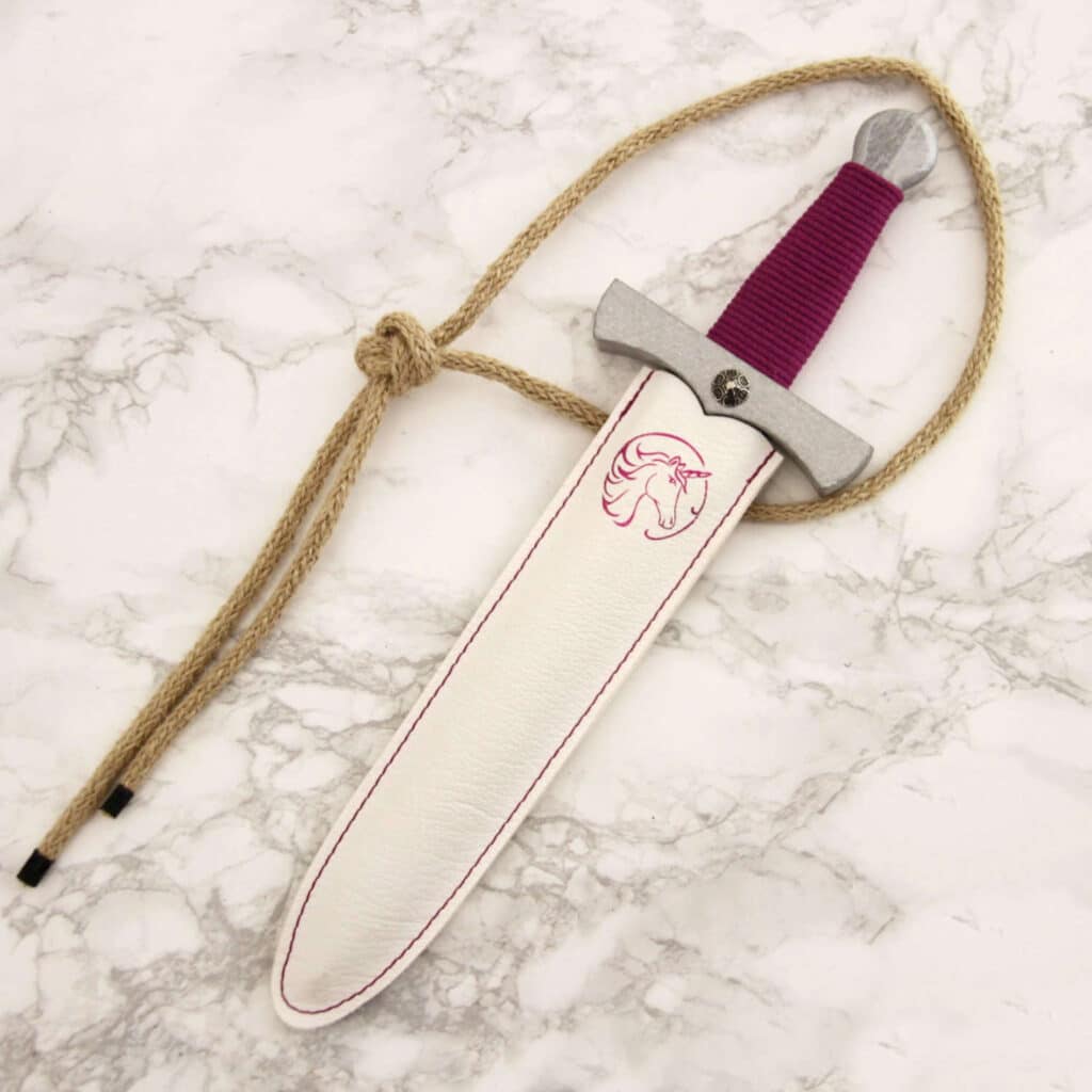 The dagger comes with a matching sheath and belt. A proper knight of course has a safe place to place their weapon when it is not in use, lest the enemy snatch it from them. In the heat of play and tournament the small knight may not always want to carry their arms, and waiting staff may not always be willing or available. The sword belt also comes in handy when practicing knightly manners, such as walking among unarmed civilians. A knight can be a knight even in busy environments, such as markets and fares, and the weapon is never misplaced by accident.