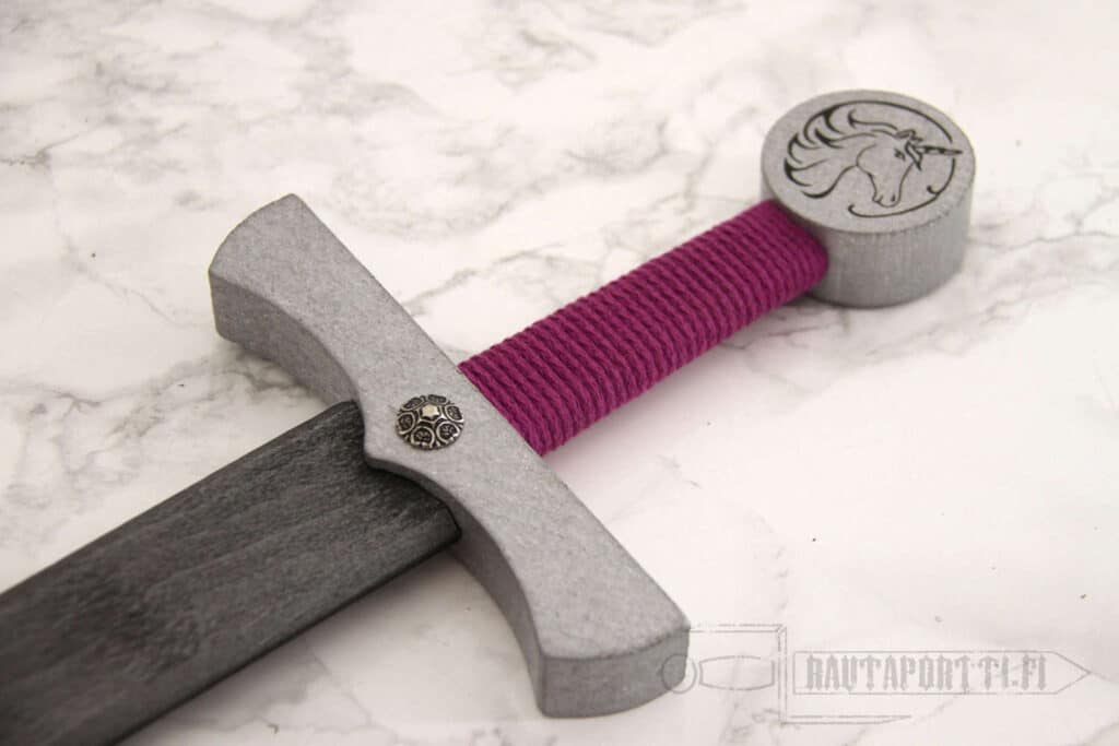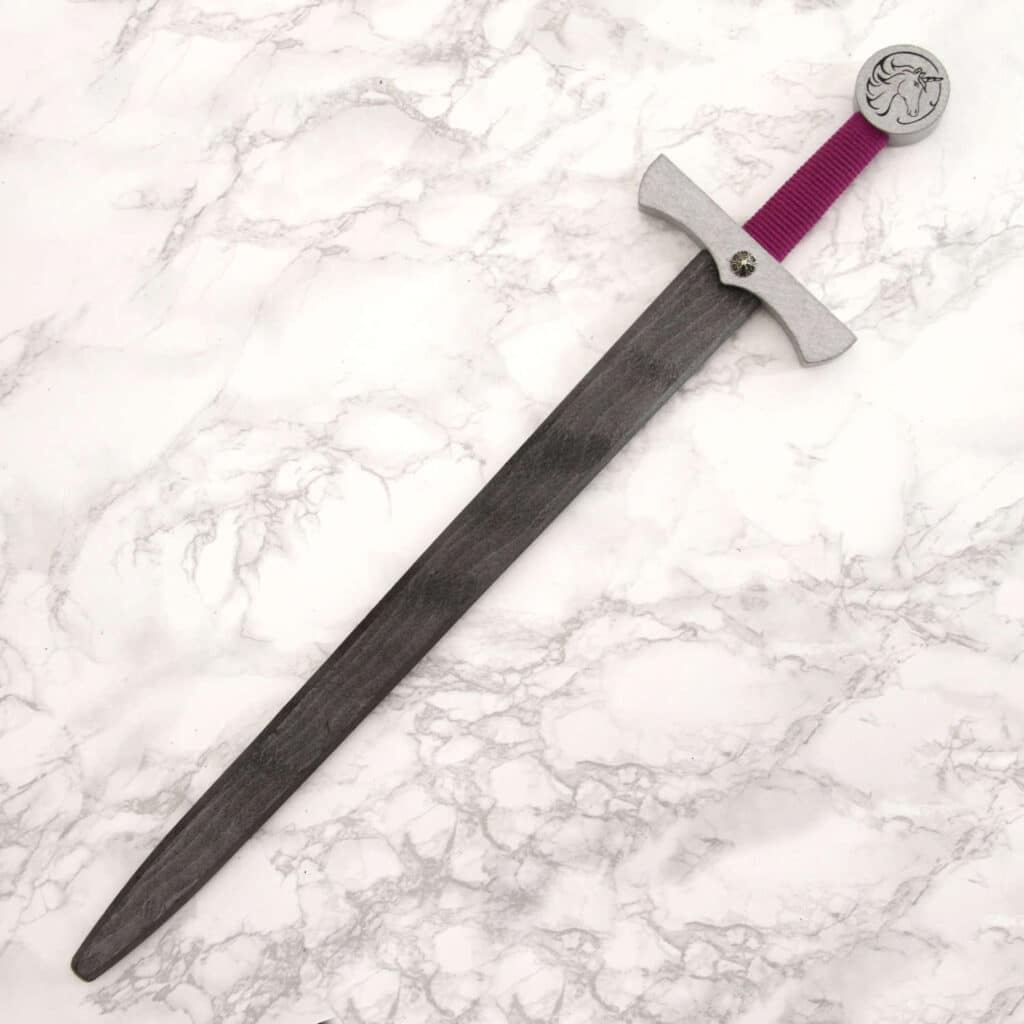 A proper wooden sword is an indispensable part of a knight’s training. Even if you are not aiming for knighthood, roleplay is such an important part of a child’s development, enhancing their creativity, social skills, all while having fun. This wooden sword, which has been painted silver, with a unicorn motif will set their imaginations running wild, and it has been proven to work in fights against monsters, orcs, dragons and other baddies. Also suitable for saving friends from a tight spot. The sword is sturdy and well made, and will withstand re-enacting even the most Horrible of Histories.