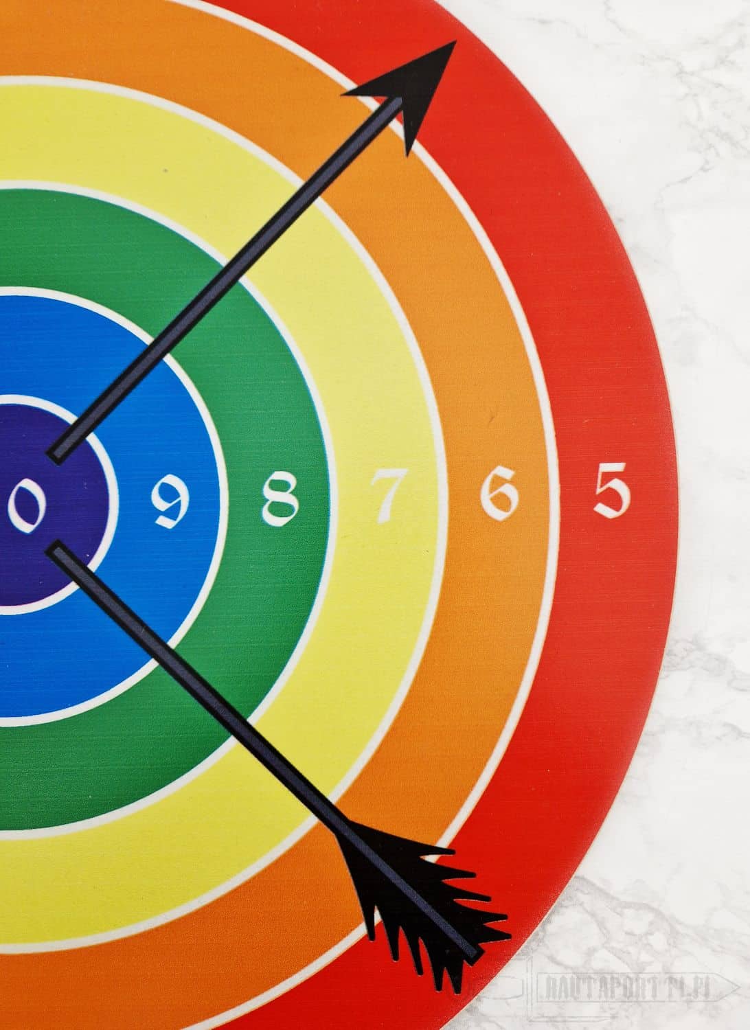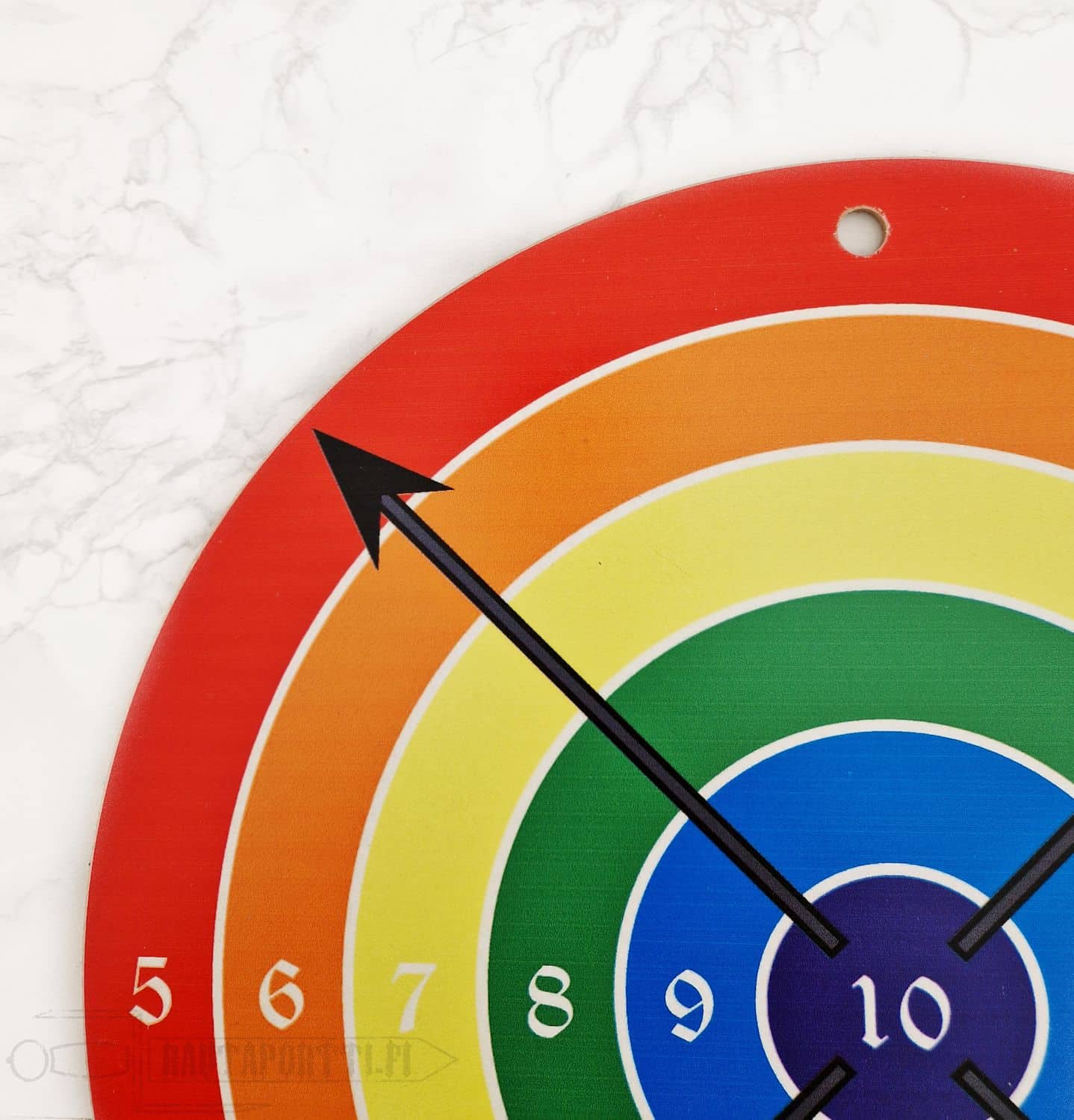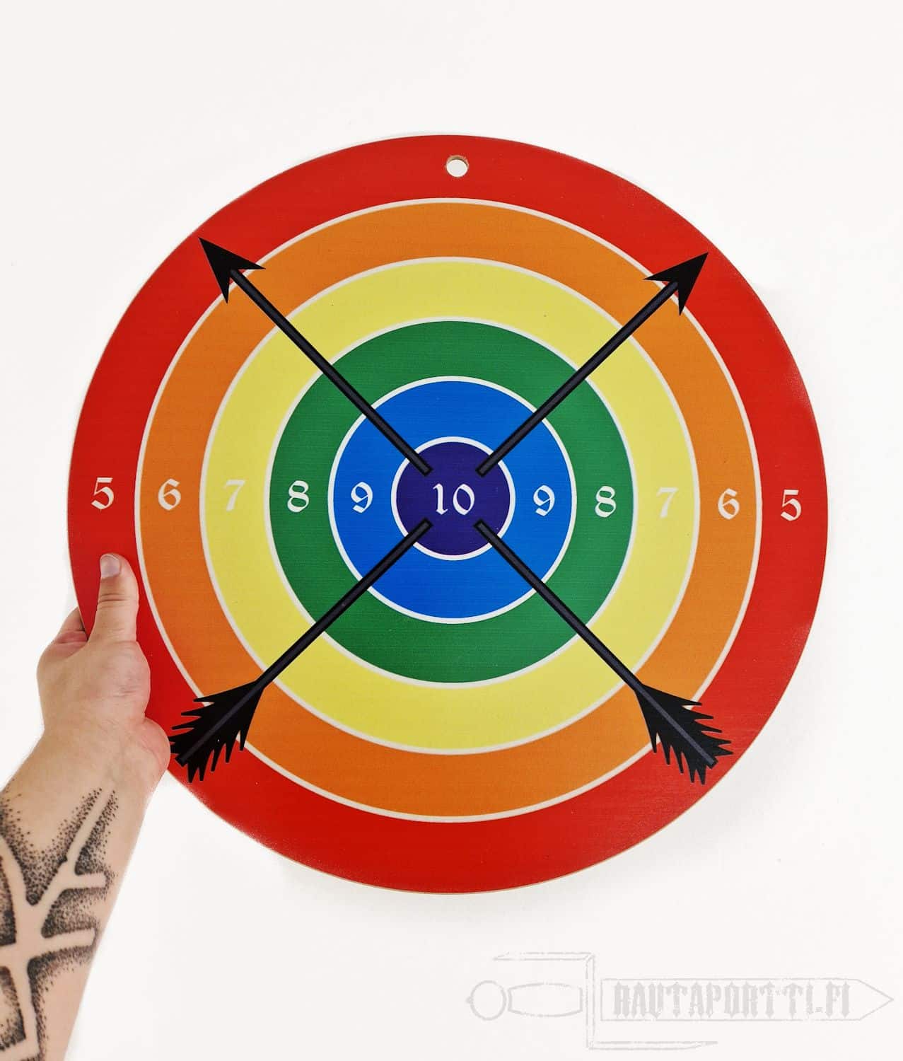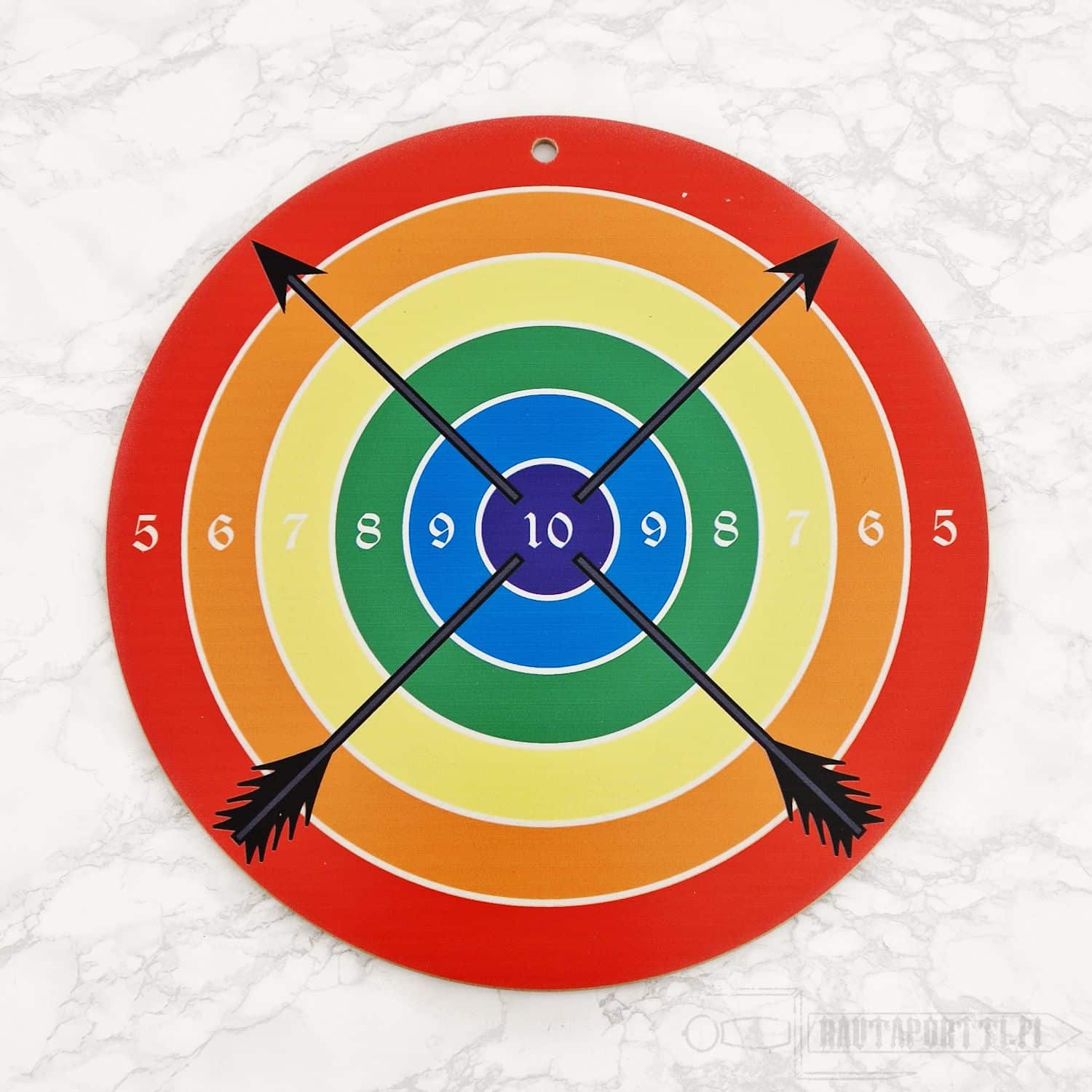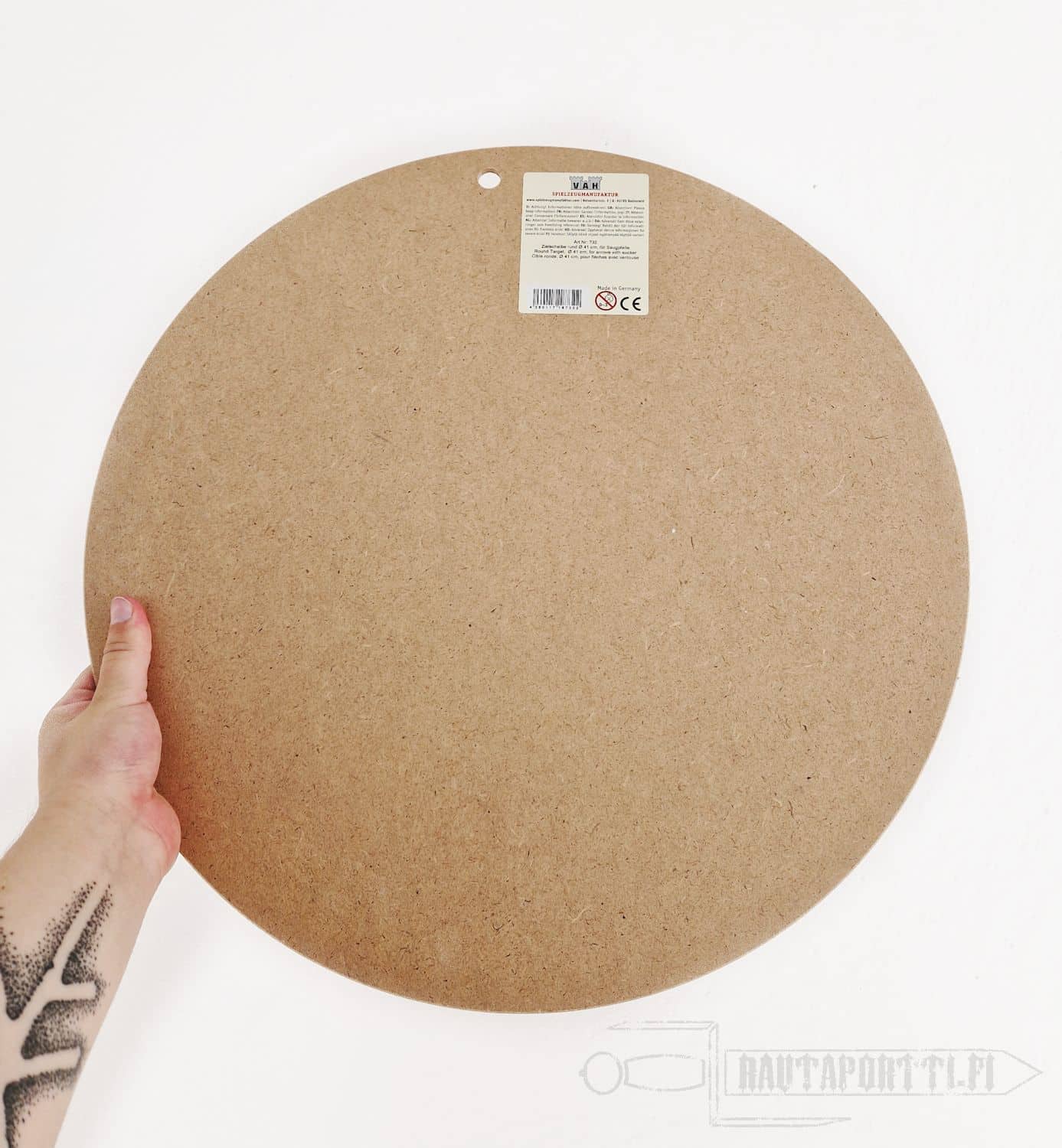 The target is made of plywood, and has a circumference of 41 cm. The board has a ready made hole at the top, so you can easily hang it from a string or a nail, either to a wall or a tree.