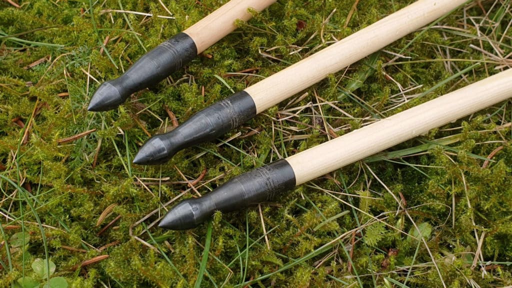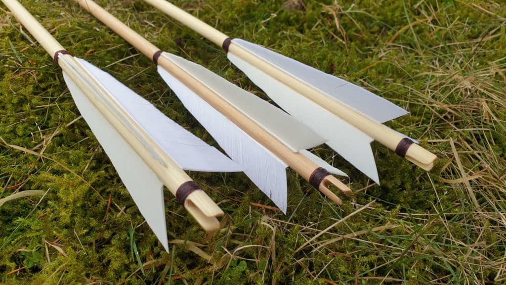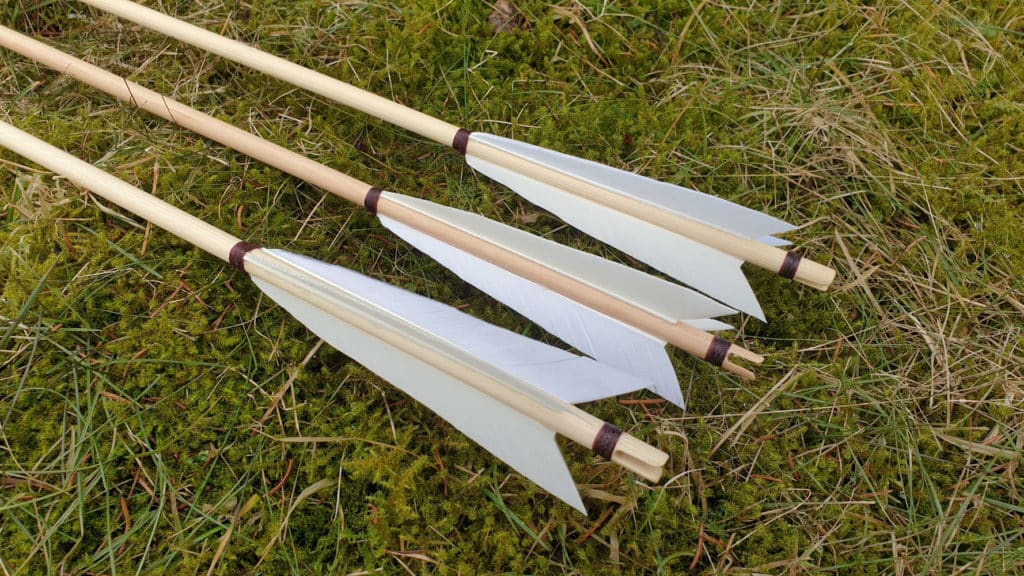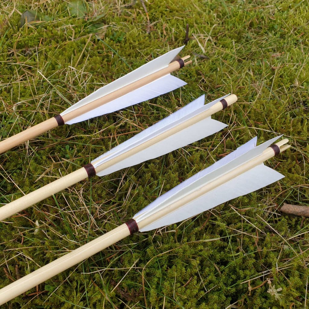 Locally made high-quality handmade arrows that work perfectly with our Medieval War Bow. These arrows can of course be used with any bow but the length and stiffness of the arrow is selected to work particularly well with our Medieval War Bow. These arrows have long white medieval style feathers and medieval style field point to suit the style and era.