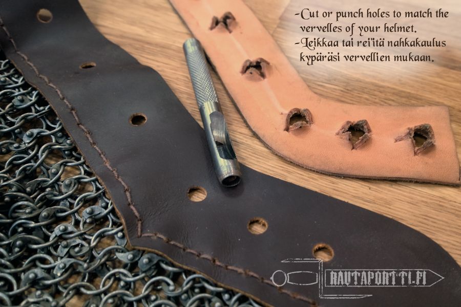 The first aventails were permanently riveted to the helmets, but in the early 14th C removable aventails, such as this, became common. In a removable aventail the top has a leather collar which is used for attaching it to the helmet. The leather has holes punched in and vervelles are attached to the helmet. The vervelles are then pushed through the holes in the leather collar. Finally the collar in secured by threading a string through the holes in the vervelles.