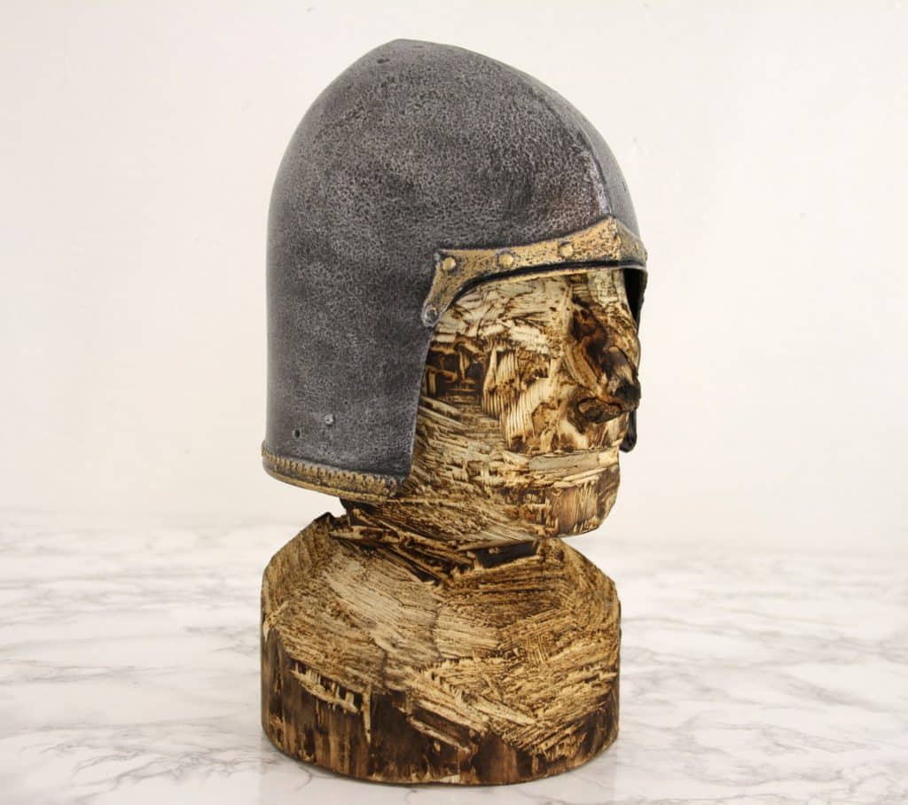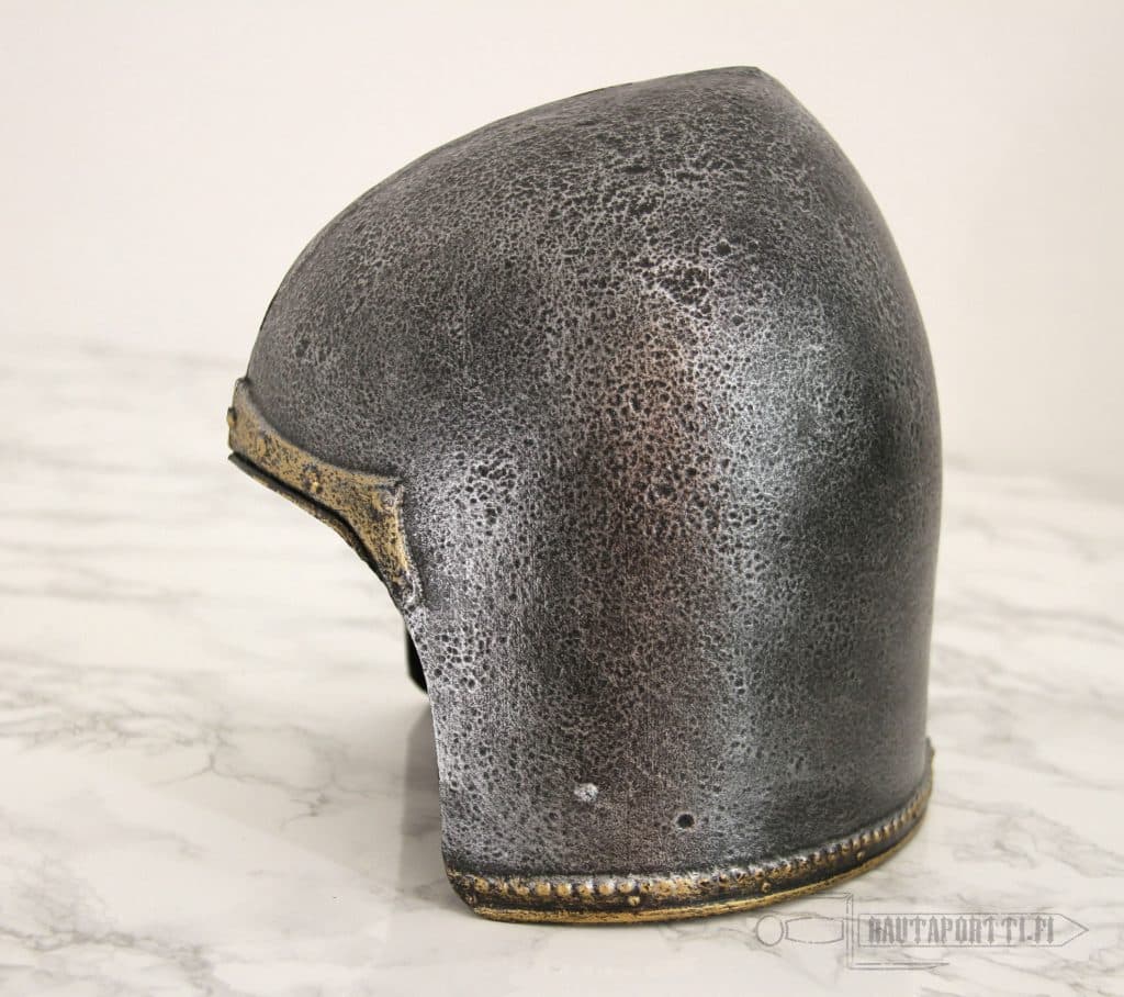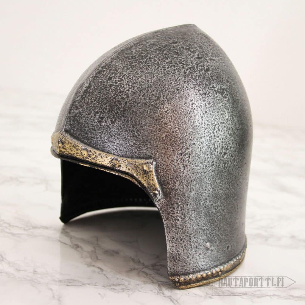 Bascinet was a common helmet type in the Late Middle Ages that rose in popularity during the 14th century and remained in use to the end of the Middle Ages. Several different types of visors, nose guards and face protections were added and were used with the standard Bascinet but this classical helmet was also used as is with no added face protection. Whether you are a town guard or a hired sword you just might appreciate ease of use and clear field of vision over maximum possible protection.