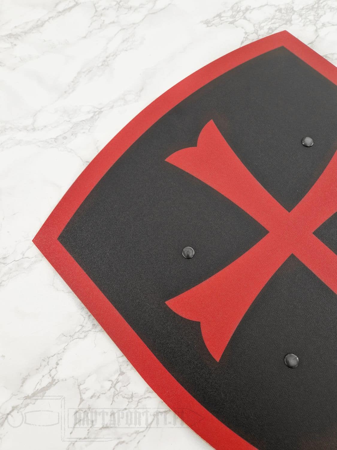 This black kite-shaped shield is decorated with a red Templar cross. Templars were Christian military order that was founded in the 12th century during the Crusades and included some of the most elite soldiers of the middle ages. They were known for their bravery in battle and their commitment to protecting Christian pilgrims traveling to the Holy Land. The order gained power and wealth throughout Europe and became very influential and powerful.