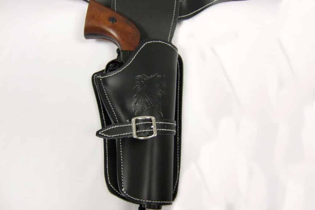 The revolver case has its own buckled leather strap on the outside, so you can tighten the case just right for your own revolver. After all you wouldn’t want your trusty six-shooter to fall out of the case when diving behind a water barrel, or for the case to be too tight and grab hold when you try to pull your revolver as quickly as possible in a duel.