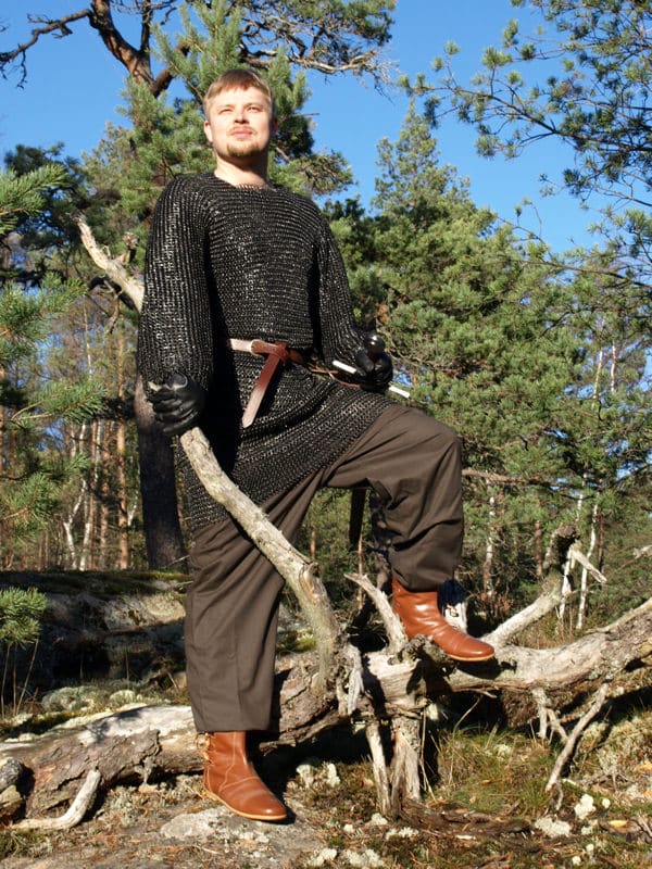 Mail shirts were difficult and time consuming to make and therefore very expensive. Good protection, however, often separated the dead fighters from the living, and so rich and powerful warriors invested. Haubergs (like this model) were used throughout Europe from the Dark Ages to the Renaissance. Hauberg is a mail shirt with long sleeves and with a skirt extending at least to the mid-thigh.
