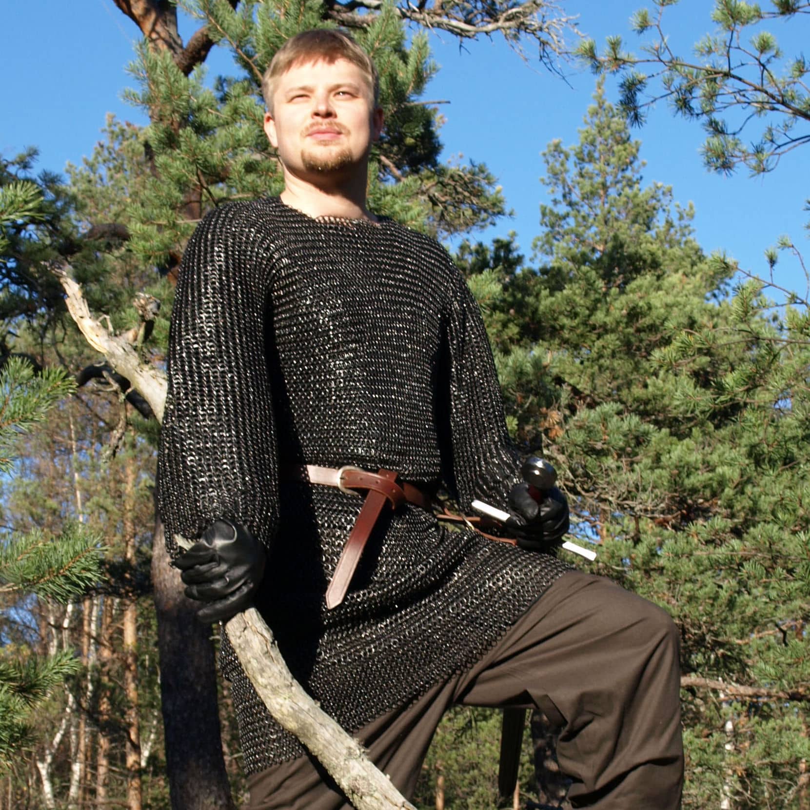 Available in three sizes. M, L and XL Made of 1,6 mm thick steel Outer diameter approx. 11mm and the inner diameter 8 mm of each ring Rings blackened for rust prevention Butted mail construction Standard European mail pattern 4 rings through 5th