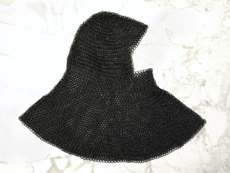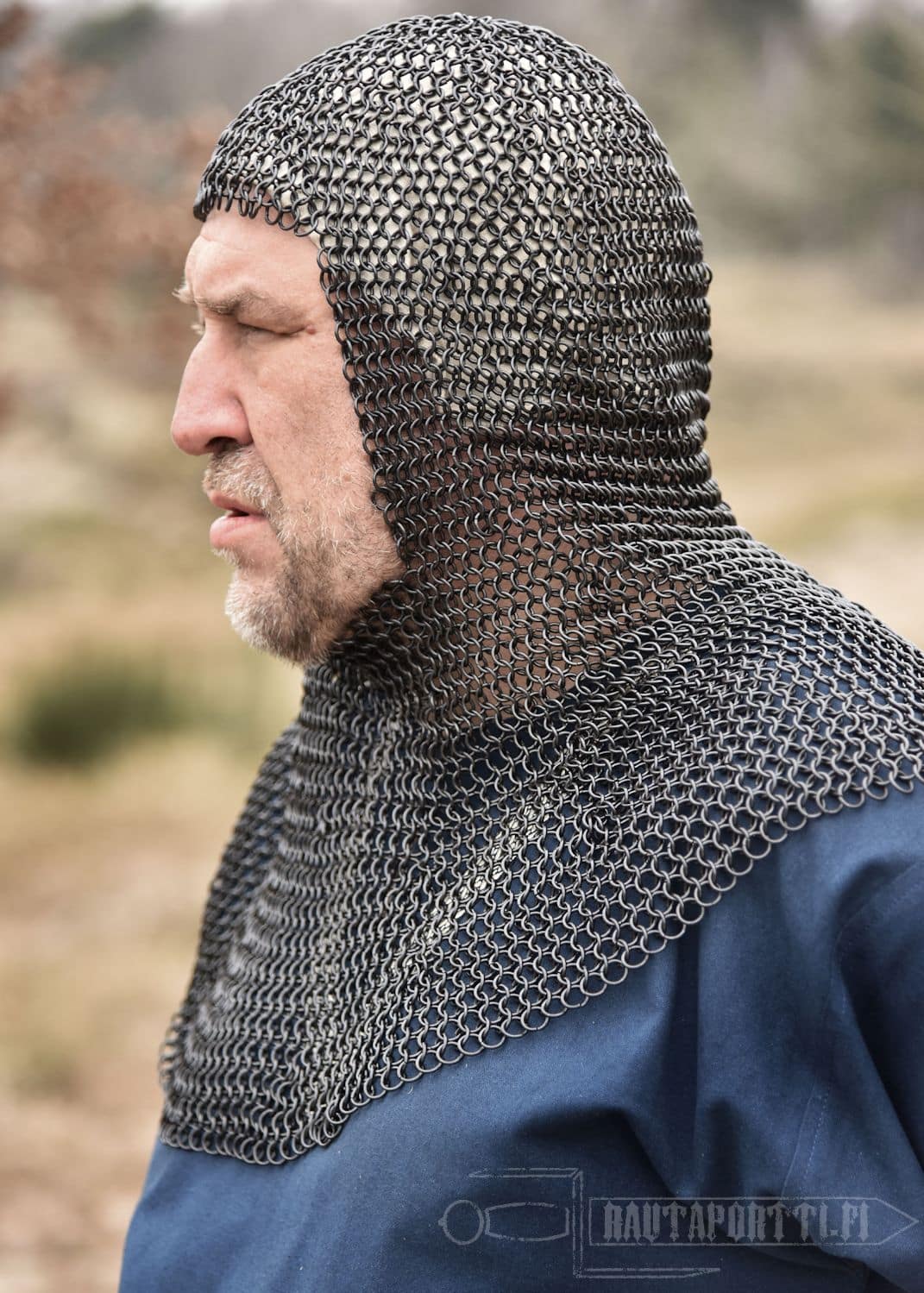 This coif is made of 1.6 mm thick steel links built in the standard European pattern, with 4 links through a 5th. Each link is blackened, which provides protection from corrosion. We however recommend that you keep the mail lightly oiled to prevent rusting.