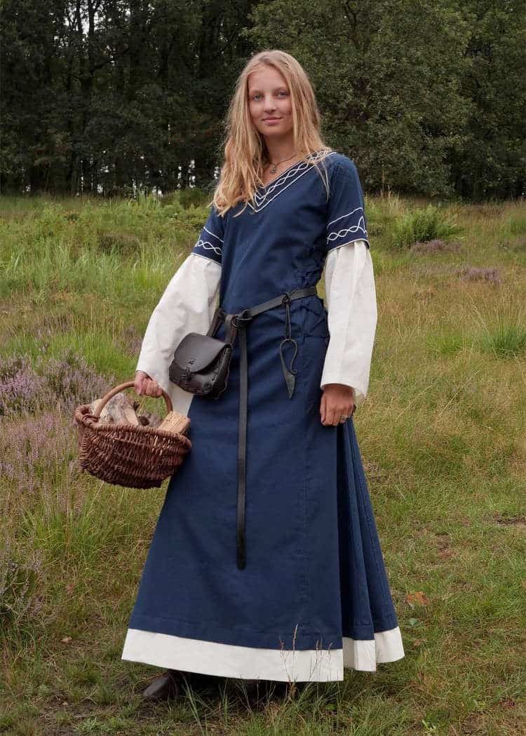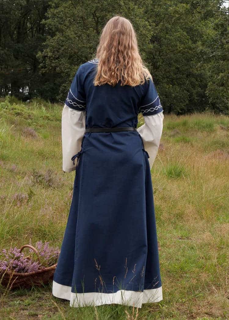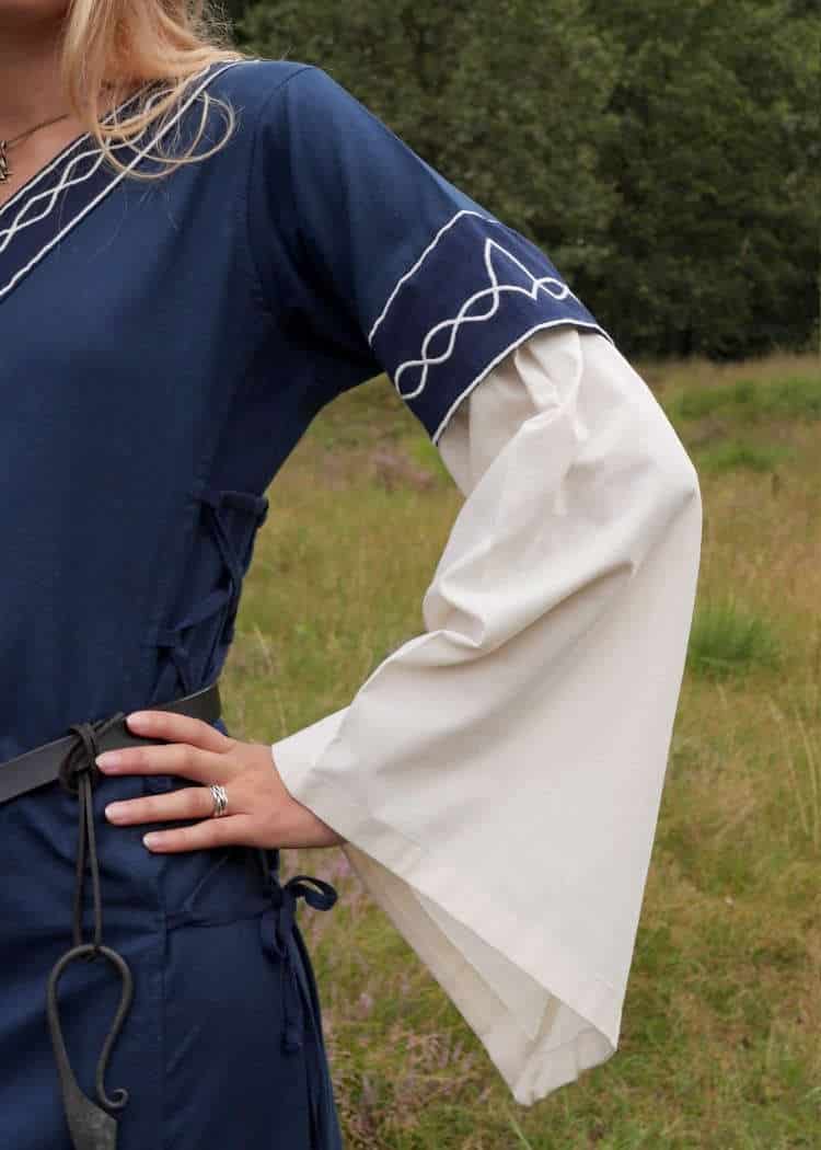 This long medieval dress is made of sturdy cotton fabric. It is loosely tailored and can be tightened with laces on both sides for an individual fit. The color contrasting sleeves and bottom hem create the impression of a shift worn underneath a short-sleeved dress. The neckline and sleeves are trimmed with embroidery.