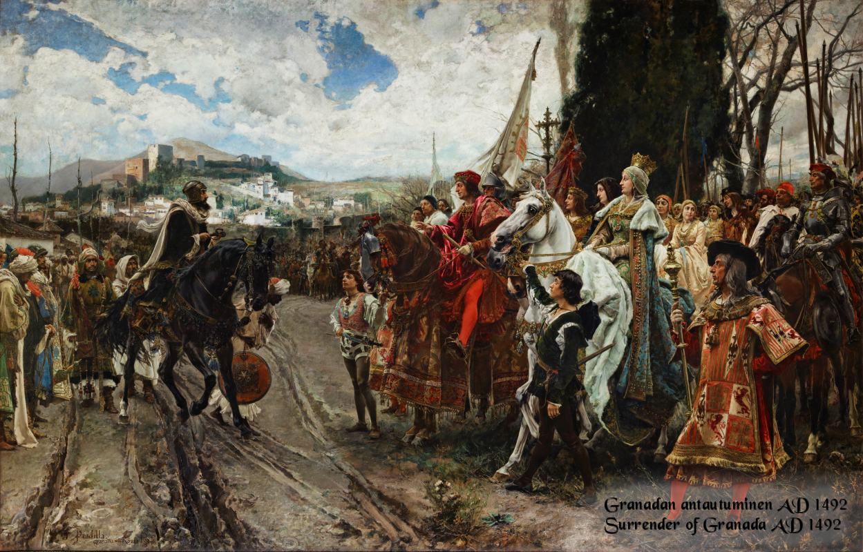 Abu ‘abd-Allah, later king Muhammad XII, is known in Spain as Boabdil (a Spanish corruption of his name). He was the 22. and the last Nasrid ruler of Granada, holding court in the palace of Alhambra. Nasrids had ruled the emirate from 1230 onwards, at the closing centuries of the arab rule of Iberia. That period had started in 711, when Moors, mainly North African Berber soldiers, crossed the Strait of Gibraltar and began their conquest of the Visigothic Kingdom of Hispania. These armies established an arab rule that would last 300 years in much of the Iberian Peninsula and 770 years in Granada.