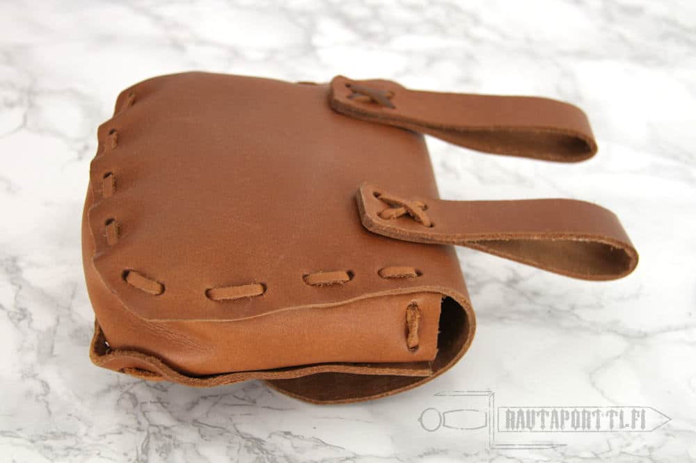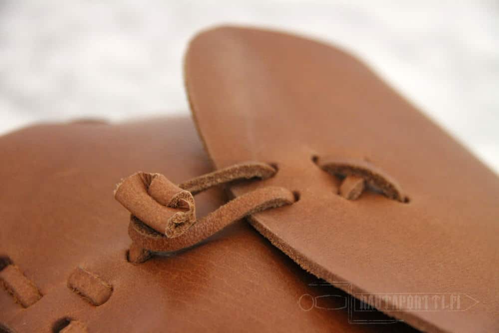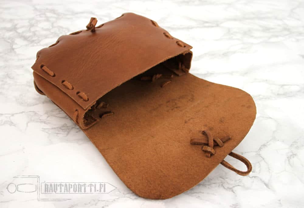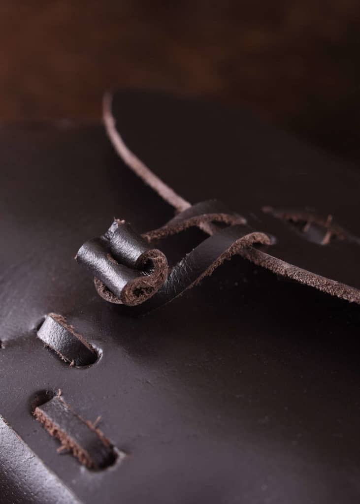 The bag is closed with a thinner piece of leather that goes around a knot, which is slightly difficult to get over the knot, but i wouldn’t worry about pulling on it too much since it is high quality leather and I don’t expect it to break any time soon.