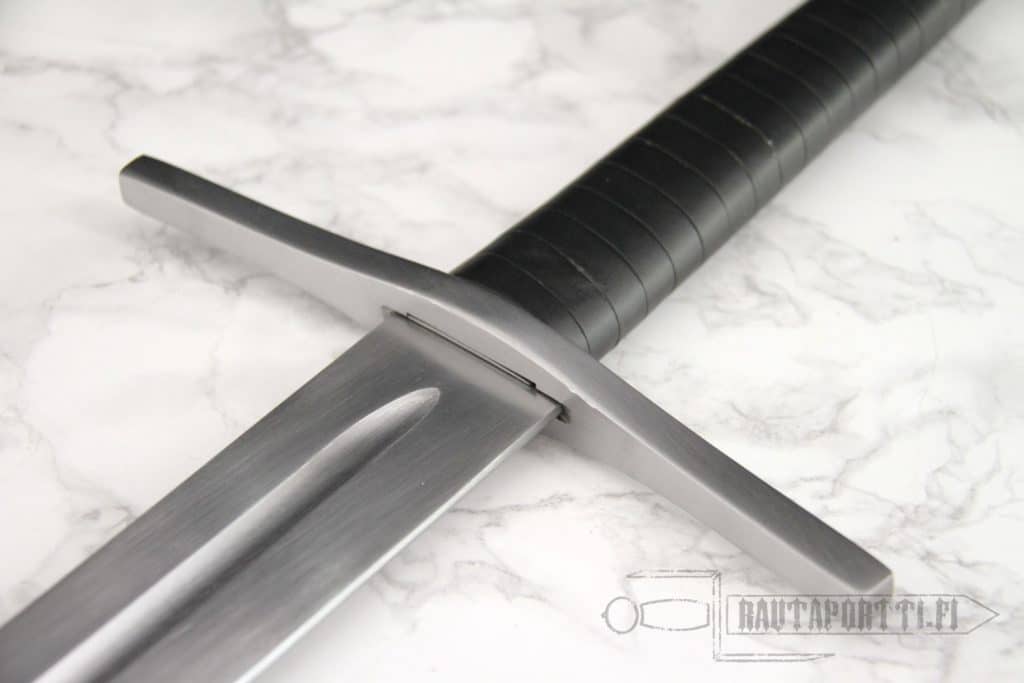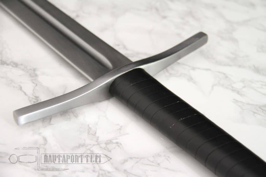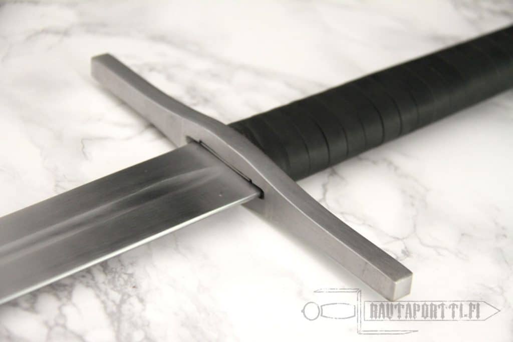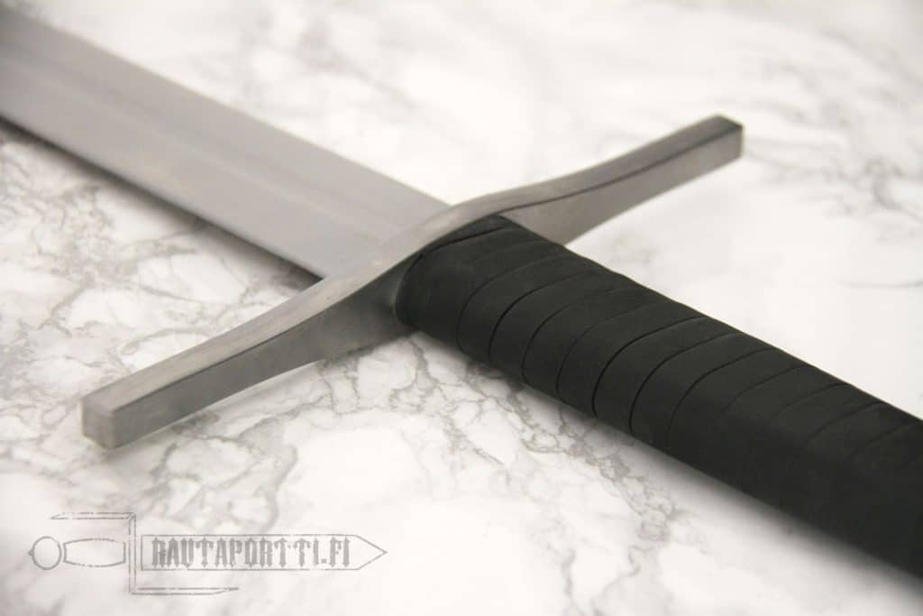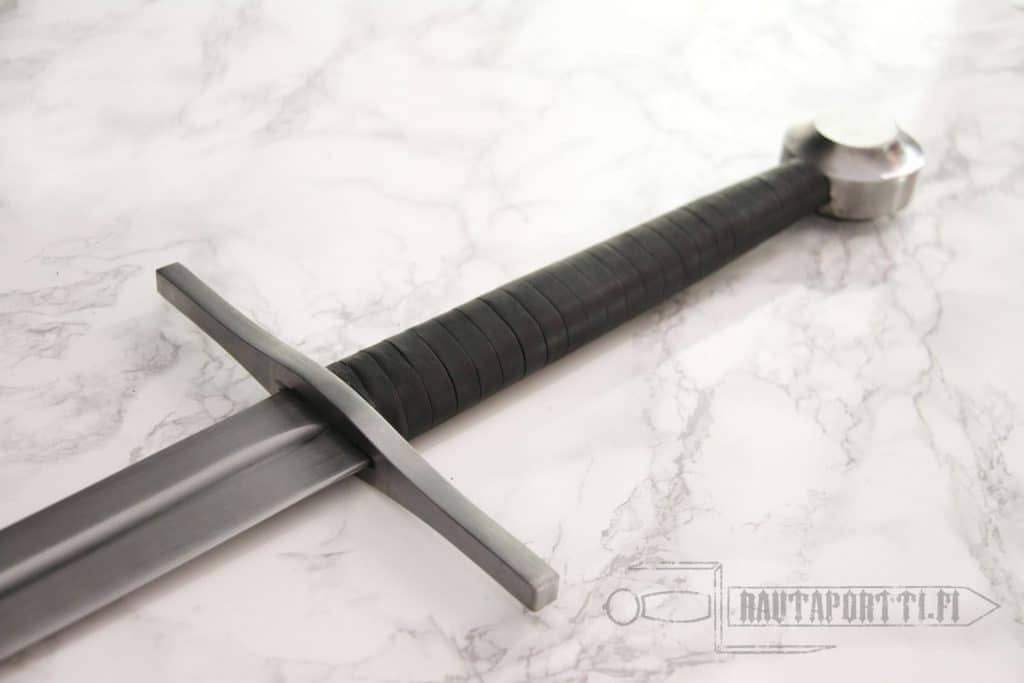 Ronskia rautaa. Laadukkaan ja tasapainoisen oloinen miekka. Tuntuinen siksi että en ole hakannut sitä haarniskaan tai vastaavaan, vaan harjoittanut asento- ja liikeharjoittelua. Väisti ja kamat on hyvin kiinni, mikään ei helise. Kahva sopii hyvin käteen yhdellä ja kahdella kädellä. Miekka on yhdellä kädellä aika raskas, mutta kahden käden miekaksihan tämä on tarkoitettu. Mutta jos ruista ranteessa niin tasapainon puolesta menee yhdelläkin kädellä. Tuppea ei tule mukana mutta sitä ei tämän sortin kapistuksessa kaivatakaan. Siisti peli.