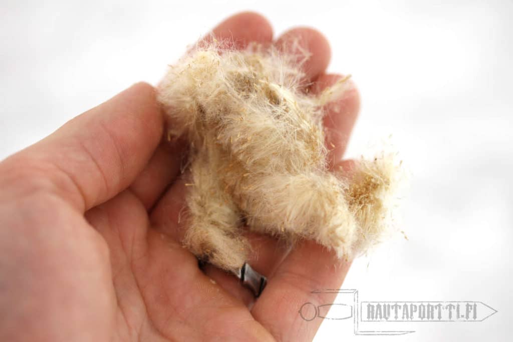 This tinder consists of the seeds of the common bulrush, popularly known as cattail or reedmace, which is extremely flammable due to the very large surface area of the seeds. The seeds have a woollen soft feel to them and the seeds have also been historically used as filling for pillows, clothes, beds etc (and still nowadays are sometimes used). Bulrush grows all across Europe and the Northern hemisphere and the seeds have been used as tinder in Europe as well as in the America by native tribes.