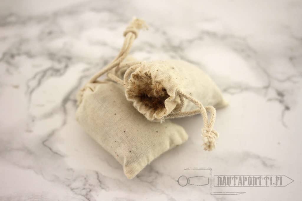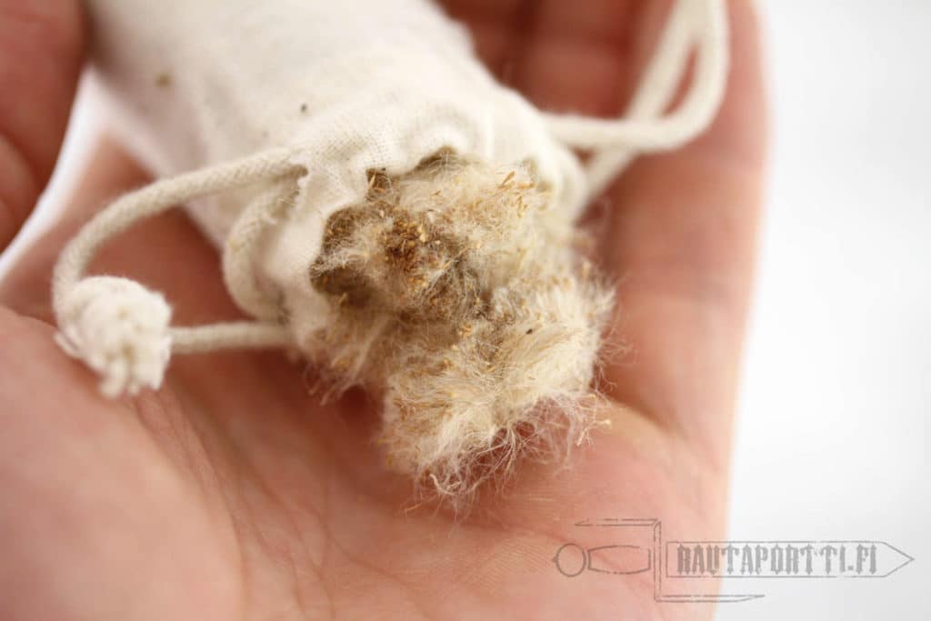 The bulrush tinder is packed tight in a small cotton bag to easily carry with you. To use it, make a small opening and pull out the tinder you need. You only need a small amount when making fire so one small bag is enough to start several fires.
