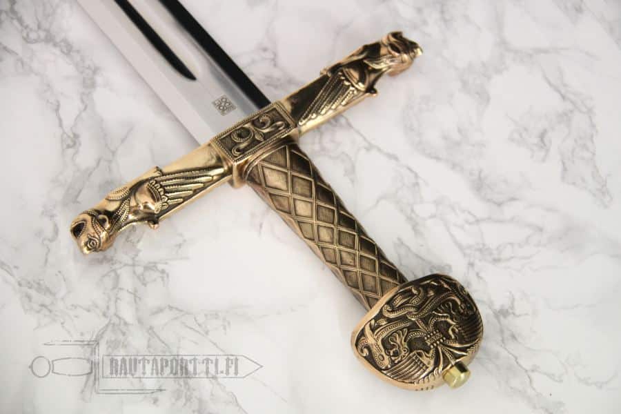 Charlemagne’s sword, “Joyeuse”, is one of the most famous swords in the world. It is the coronation sword of French kings and the original is kept in the Louvre. According to tradition, the Joyeuse was Charlemagnes personal sword, and legend states that it was forged by the famous blacksmith Galas, and took three years to complete. The sword was described as having magical powers, having been so bright that it could outshine the sun and blind enemies in battle, and any person who wielded it could not be poisoned. One story tells of how Charlemagne once lost Joyeuse and promised a great reward to whoever found it. One of his knights returned it to the king who stuck it in the ground and declared the lands around that spot to belong to the knight, which is the origin of the French town of Joyeuse, founded on that spot and named in honor of the sword.