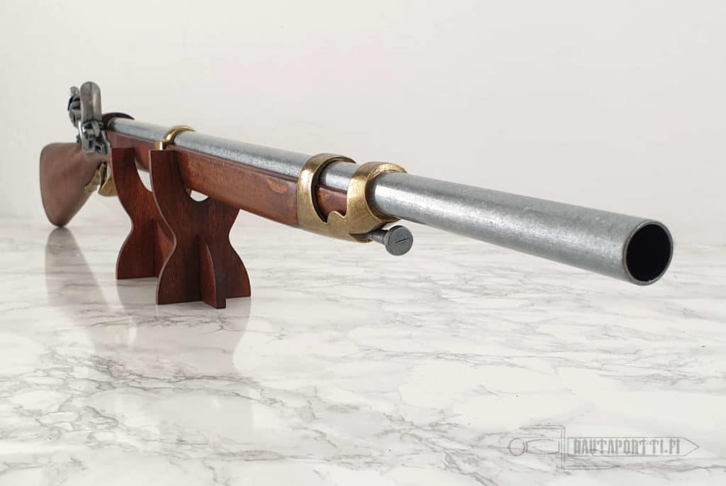 When loading a flintlock gun, black powder from a gunpowder horn was first poured into the barrel or a ready-made powder cartridge wrapped in paper was inserted into the barrel. A bullet, typically a ball cast from lead, was pushed after the powder. The bullet was pushed to the bottom of the barrel with a long ramrod, which made the charge a tight package at the back of the barrel. When the trigger was pulled, the hammer swung forward and the flint attached to the jaws struck the frizzen. The sparks generated by the impact ignited the ignition powder in the pan. This “flash in the pan”, in turn, burned to the barrel side of the gun along a small channel, igniting the actual gunpowder charge which propelled the bullet to its target.