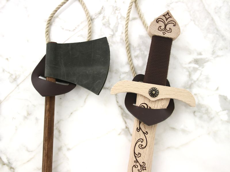 Fits together with almost any children’s sword or dagger on the market. If the width of the blade is wider than the mouth of the hanger 5.5 cm you can widen the mouth of the hanger using for example scissors.