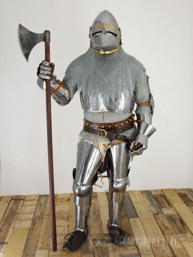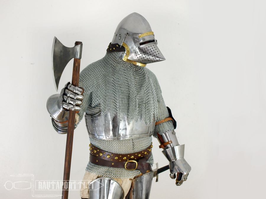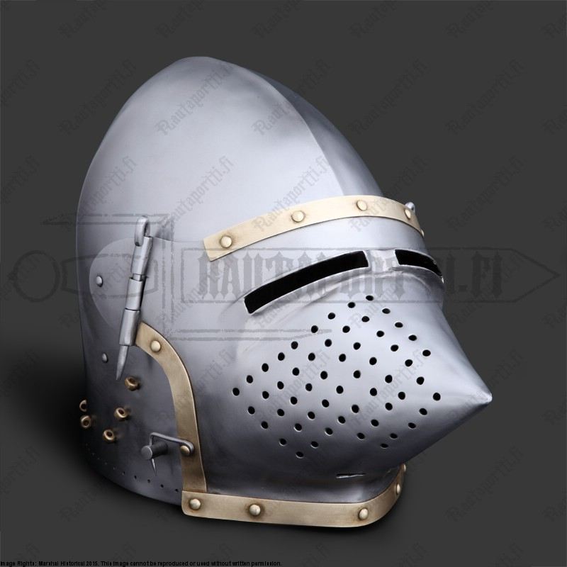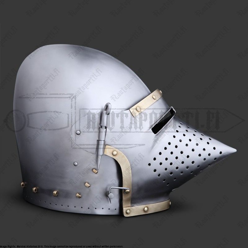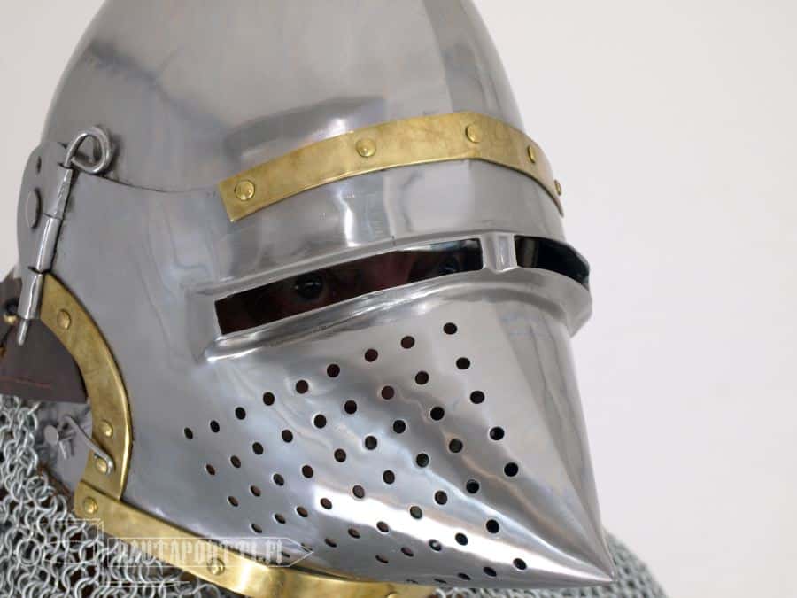 The bascinet dates to 1360-1370, and thanks to its sharp houndskull visor it is one of the most iconic and recognizable helmet types from the middle ages. The shape of the visor is aesthetically pleasing, but the shape derives from pure functionality: it was the best way to stop a rain of arrows and glance them to the side.
