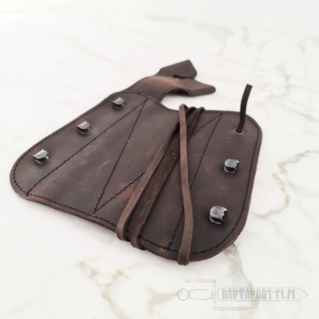 Combines arm guard and shelf glove into one piece of kit to wear Minimizes the risk of bruising and abrasions to the bow hand and arm Arm guard protects the bow arm from bowsting slap and bowstring contact Shelf glove protects the bow hand from arrow abrasions and scratches caused by fletching Fastens with leather cord around the hand Made of high quality soft brown leather Available four sizes: S, M L and XL