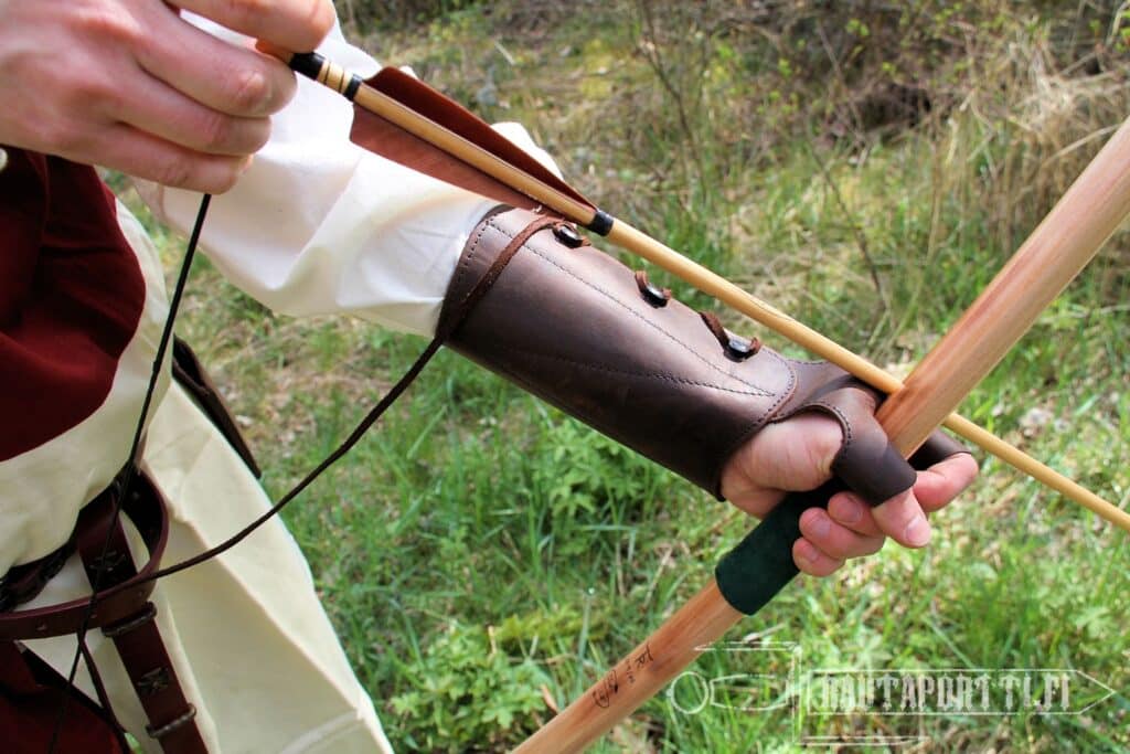 Traditional armguard protects the arm from any bowstring slaps and bowstring contact. Armguard also collects wide sleeves tightly around the arm away from interfering with the shooting.