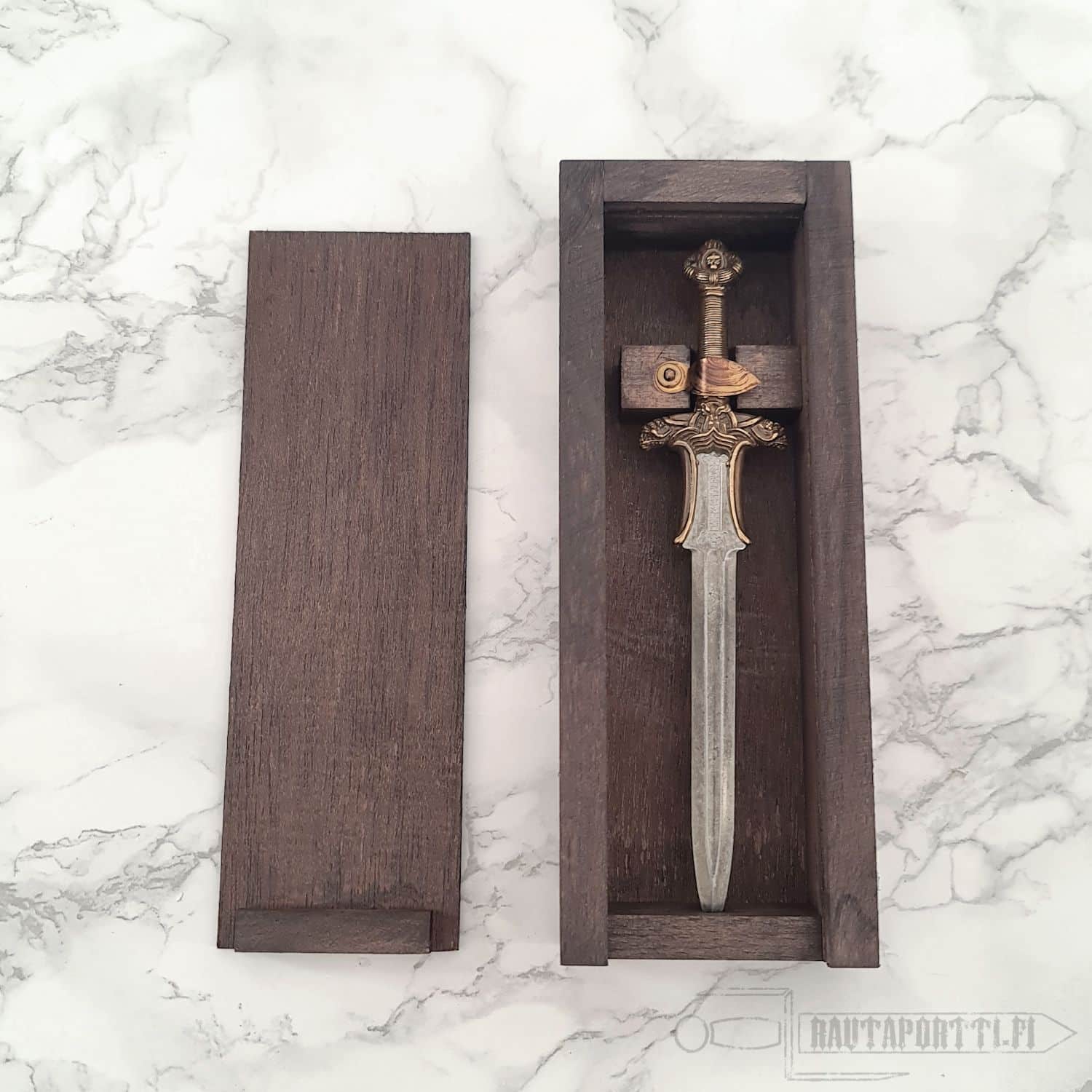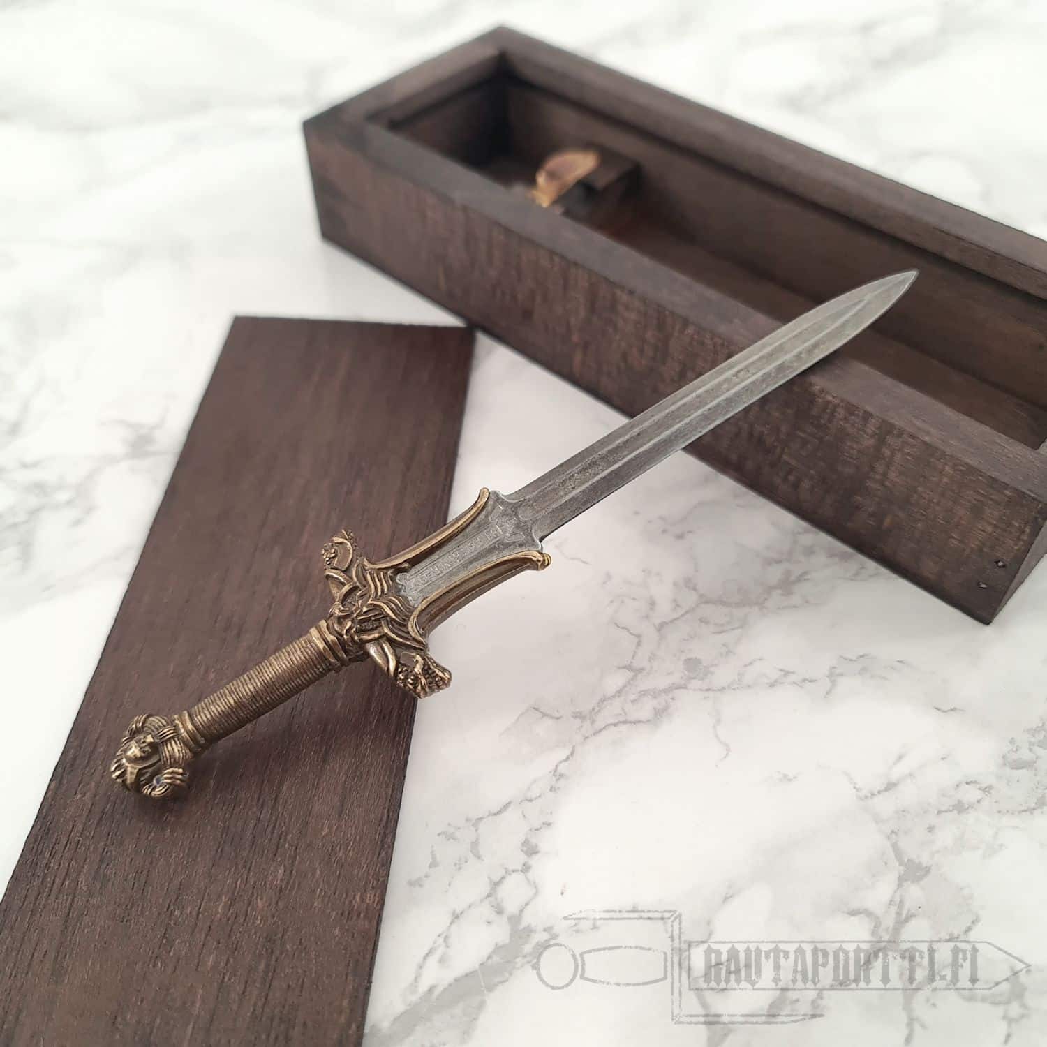 Featuring the same barbarian details as the full-sized original, we offer the Conan the Barbarian Atlantean Sword letter-opener. It has been beautifully scaled down from the full-sized replica. The blade still bares the same runes as the full-sized weapon, and the pommel is still decorated by the same human skull. A double-headed serpent forms the guard. The only detail missing is the authentic rope wrapping the handle. The miniature sword can be used as a letter-opener. Stand not included. Comes with a wooden presentation box.