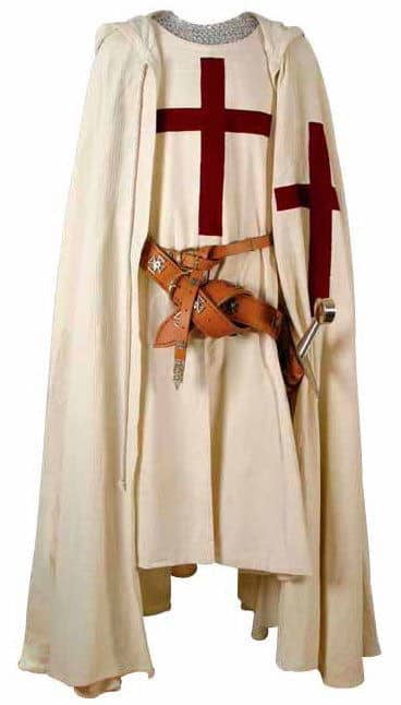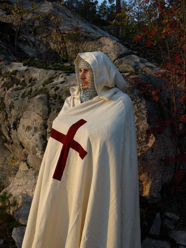 This long hooded Crusader’s cape is of heavy cotton with corded tie. A full red cross, typical of the Crusaders is embroidered on the left shoulder. The cape can be attached with strings hidden on the shoulders and closed from the front with a corded rope.