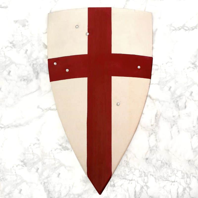 Core of the shield is made of wood, curved like the originals Shield is padded in front with a thin foam to protect synthetic or soft weapons in combat training Covered with canvas with painted cross Adjustable arm straps made of durable thick leather Size 81 cm x 51 cm. Weight 2.3 kg