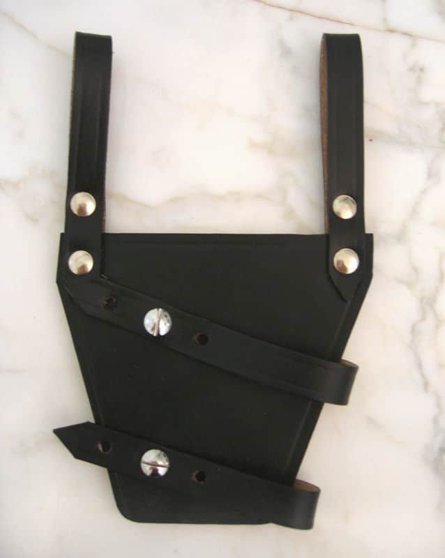 When going to war nothing unnecessary was carried, and therefore the scabbards and sheaths were left home to await the victorious return of the warriors. The reserve weapons were carried blades exposed and ready to be drawn in either metal rings or in leather hangers of the type we sell. A knight could have a longsword in hand, a shorter single hand sword on his left side and a dagger on the right. This streamlined dagger hanger is hand crafted from the finest quality leather with nickel plated steel. The adjustable leather straps allow for any width of dagger blade to be used. Belt not included.
