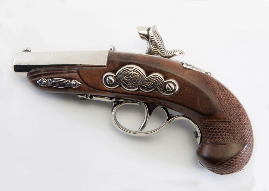 This original Philadephia Deringer was a muzzle-loaded, one-shot, pocket-sized, and easy-to-hide emergency weapon of the Wild West. Henry Deringer designed the original in 1852, hence the name of the gun. For some reason, however, his name twisted into the form Derringer, which became the common name for any small pistol that could fit into a pocket or a palm, so that even today modern small pistols are commonly and often referred to as Derringers.