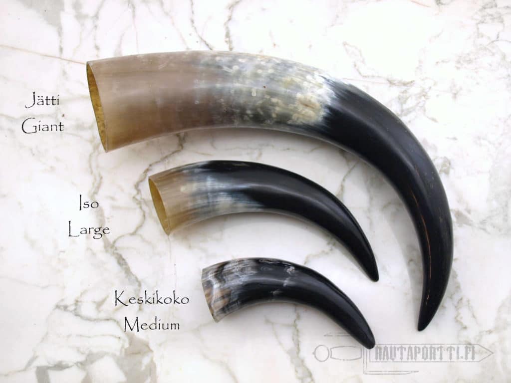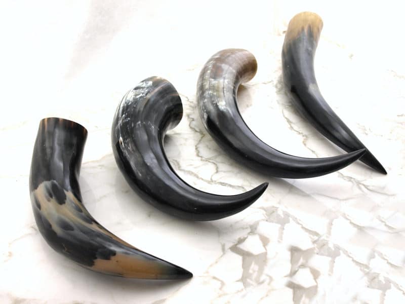 These drinking horns are all natural and authentic horns, but have been varnished with food safe varnish to comply with modern health and safety rules. The varnish also diminishes the natural smell of horn that some don’t fancy. These horns can be used for drinking both alcoholic and non-alcoholic beverages alike. These drinking horns are not suitable for hot drinks but work fine with cold or warm drinks. Boiling hot tea for example can cause the horn material to soften and lead to the varnish flaking off. Hot drinks don’t cause harm to the horn but horn is traditionally shaped by soaking it in boiling hot water. Boiling hot water makes the horn malleable.