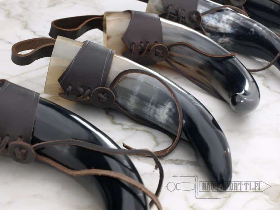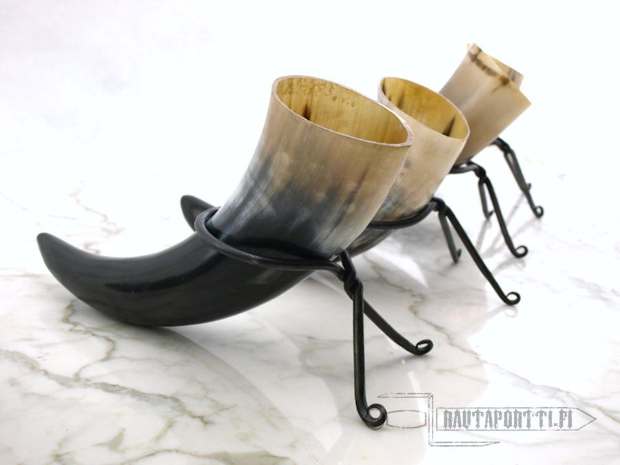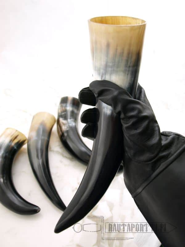 These drinking horns are all natural and authentic horns, but have been varnished with food safe varnish to comply with modern health and safety rules. The varnish also diminishes the natural smell of horn that some don’t fancy. These horns can be used for drinking both alcoholic and non-alcoholic beverages alike. These drinking horns are not suitable for hot drinks but work fine with cold or warm drinks. Boiling hot tea for example can cause the horn material to soften and lead to the varnish flaking off. Hot drinks don’t cause harm to the horn but horn is traditionally shaped by soaking it in boiling hot water. Boiling hot water makes the horn malleable.