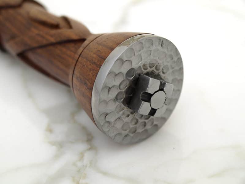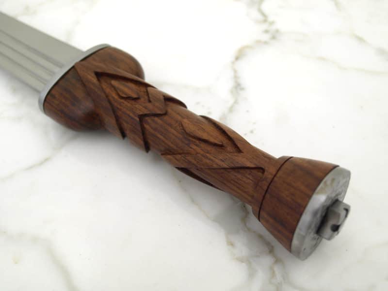 - The hardwood handle is carved with a chevron-like pattern appropriate for the time period