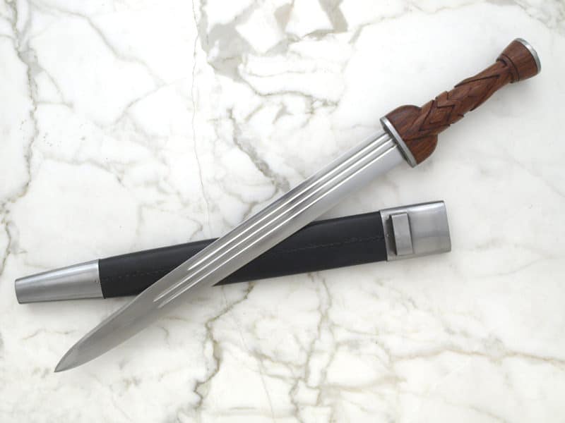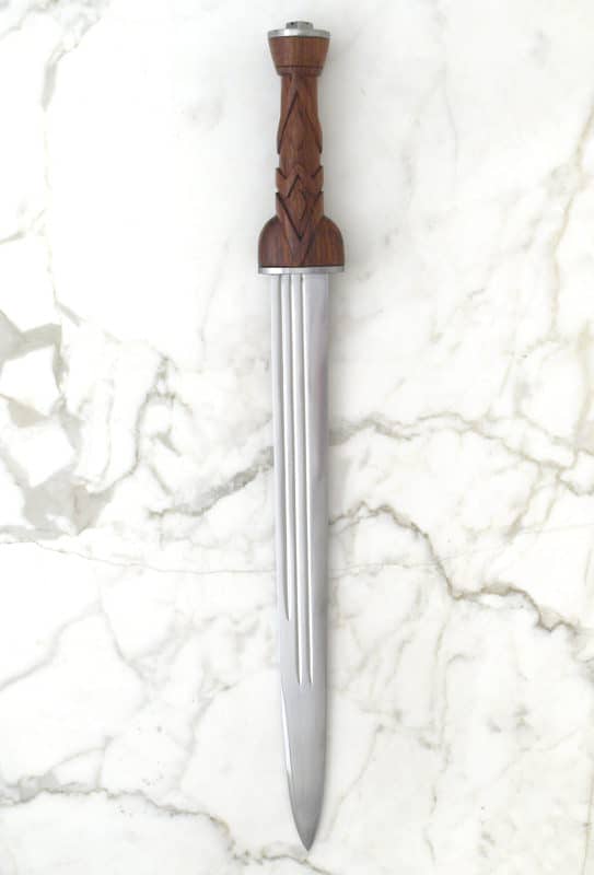 This weapon was typically used either alone, with a shield and a sword, or just with a basket-hilt claymore. This replica is made from an early version of the dirk. The hardwood handle is carved with a chevron-like pattern appropriate for the time period. Includes leather covered wooden scabbard. Circa 1550.