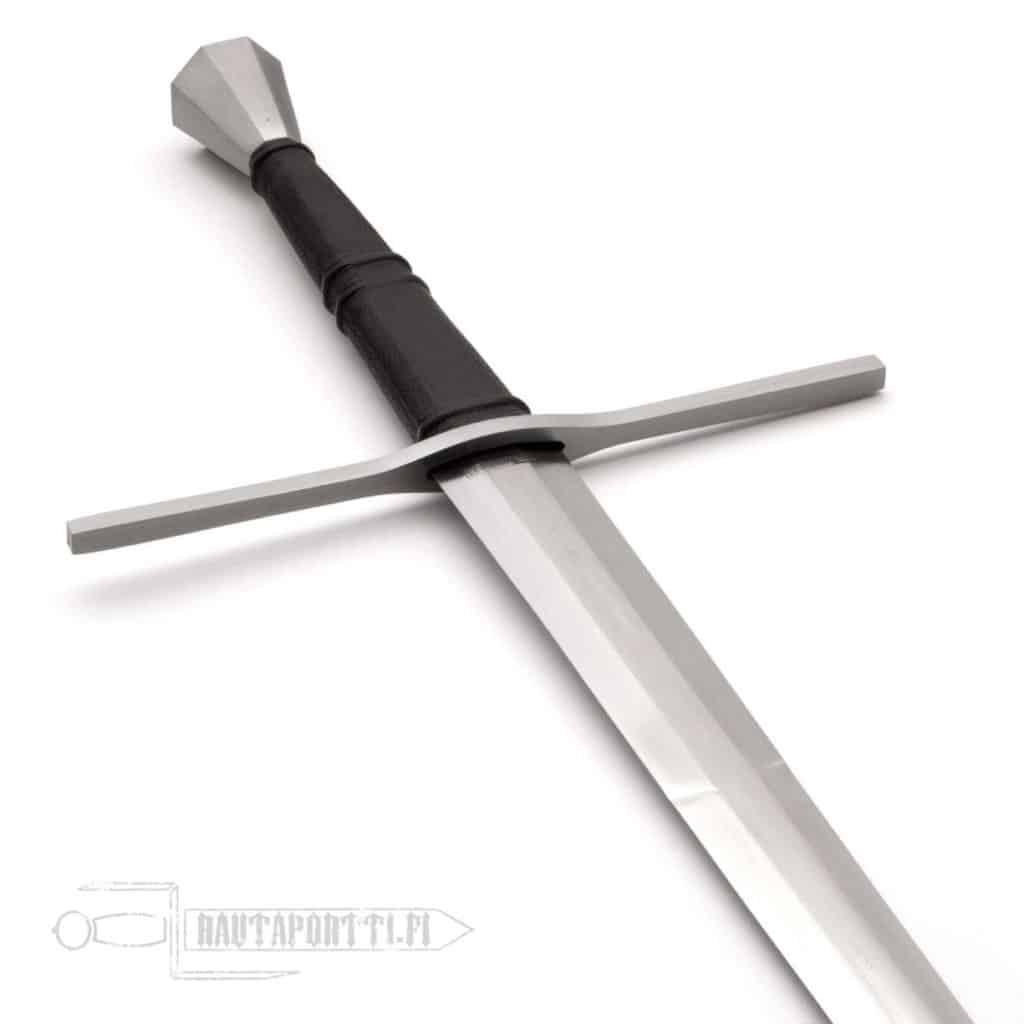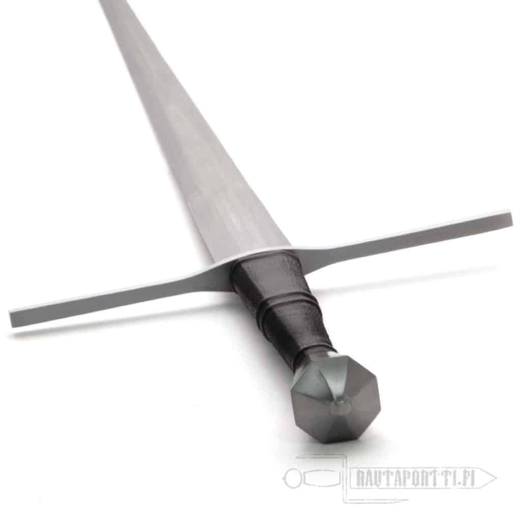 This is the type of sword that English knights would have carried for example at the Battle of Agincourt. The blade of this sword has three transitions, from a hollow ground blunt ricasso next to the guard, to a hexagonal cross-section and finally to the flattened diamond section point. A relatively nimble sword, but with more blade presence than you might expect.